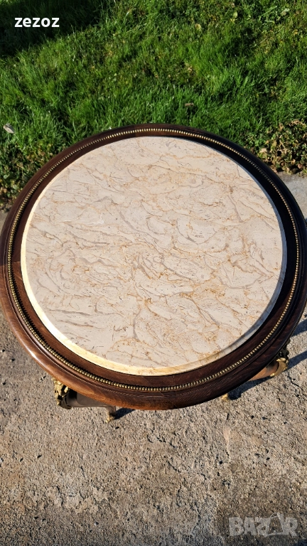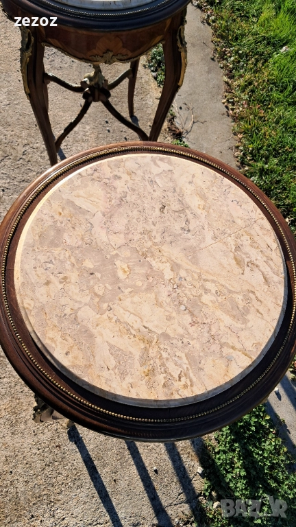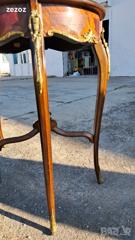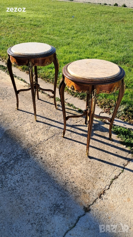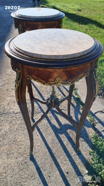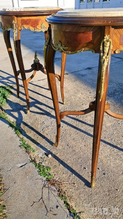 Двойка антикварни акцентни или помощни маси от началото на 20 век.Изработени в стил Луи 15 "Рококо",извити форми,изящество и лекота.Масив с интарзия от различни естествени фурнири.Богато украсени с бронзови елементи"Ормолу".Включително и по плота и в средата на опорите между краката.Извити кабриолни крака с бронзови "обувки"