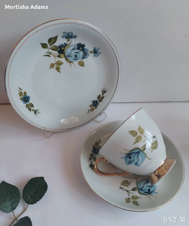 ⚜️ Великолепен полски Wawel- троен сет за чай- фин порцелан, богато украсен със сини рози и елегантна позлата: