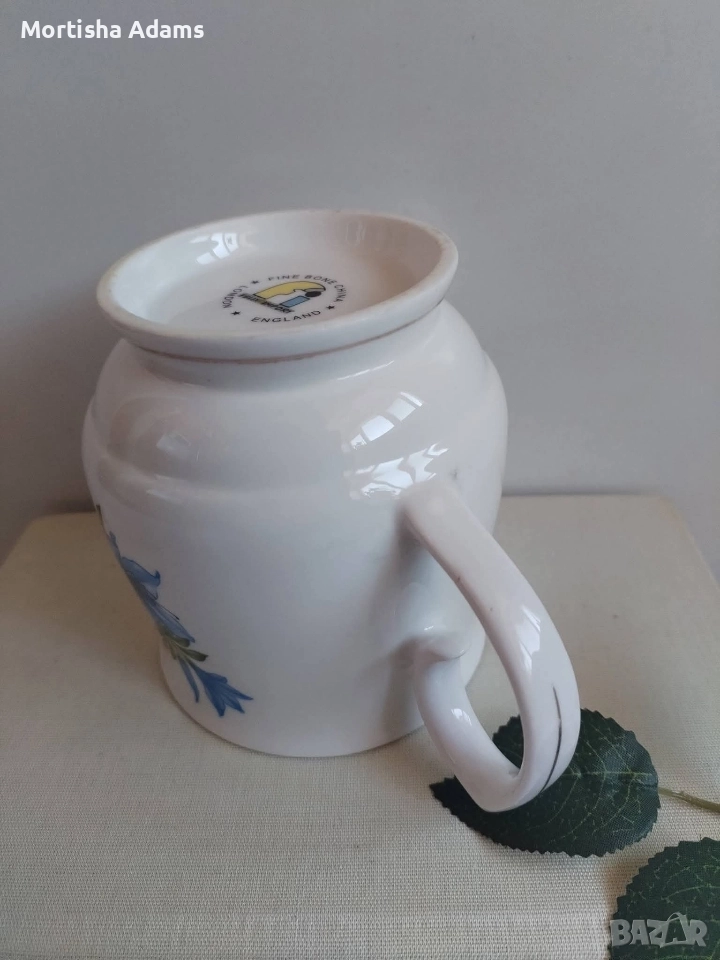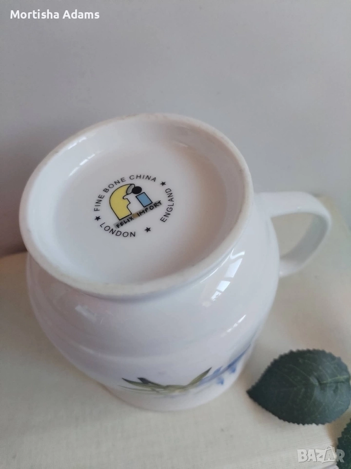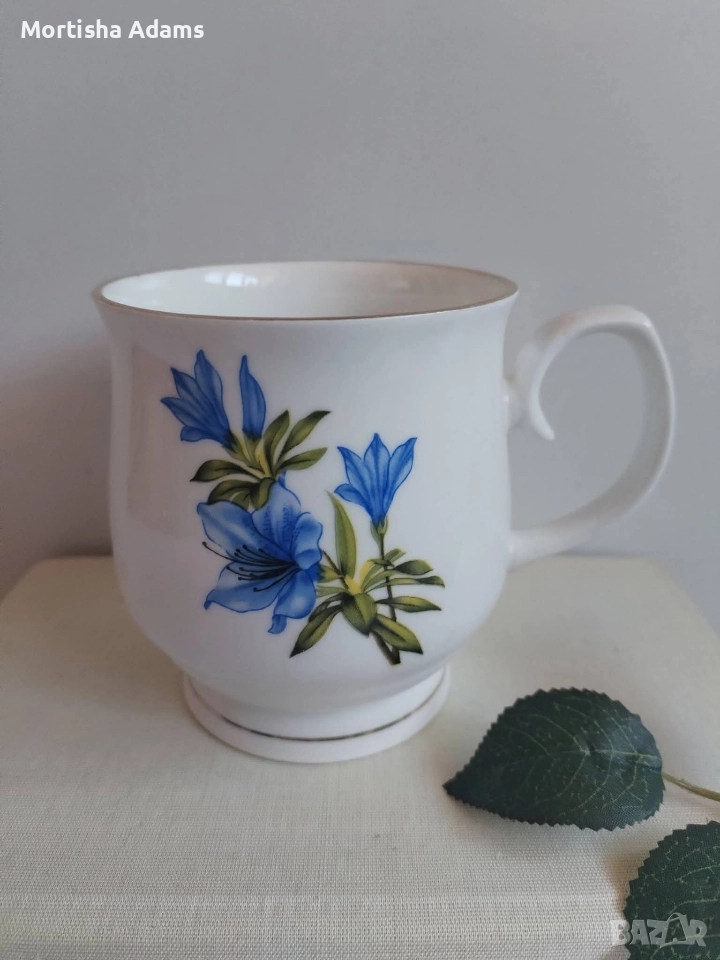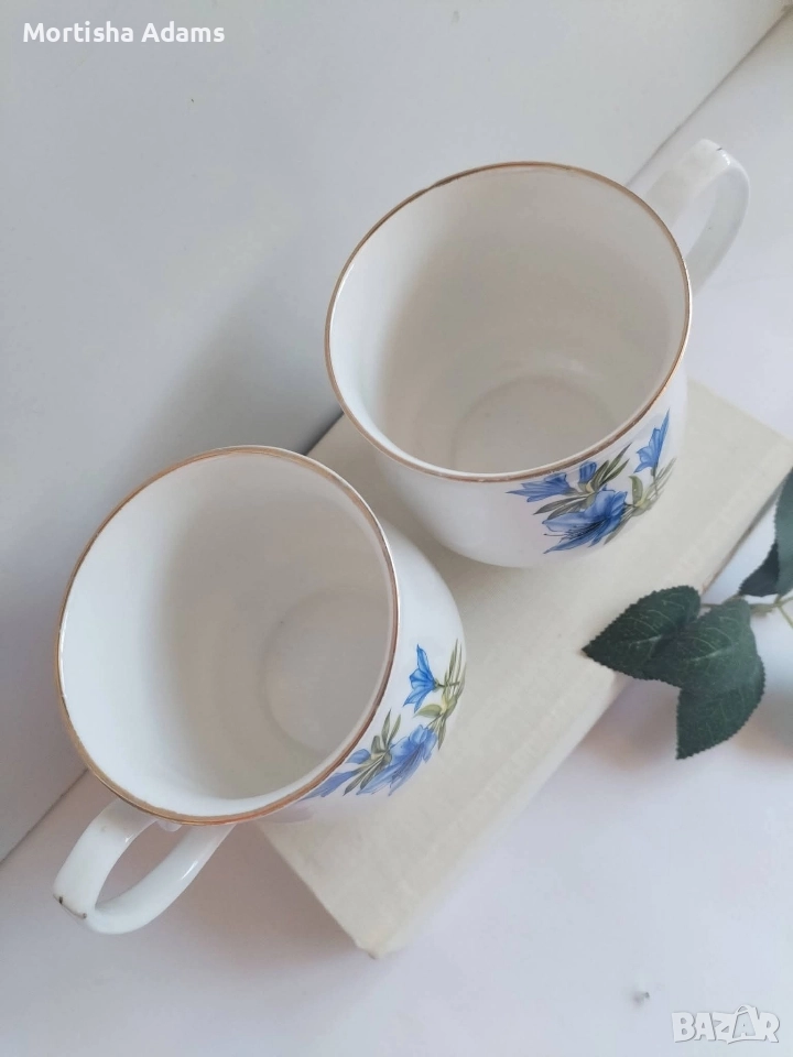 ⚜️ Две изключително нежни чаши- мъг, английски костен порцелан с двустранен декор, височина 9,5см., диаметър на отвора 8,5см. и вместимост 400мл. Здрави, дребни несъвършенства на златния кант на отворите.
