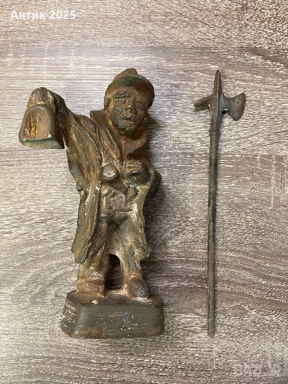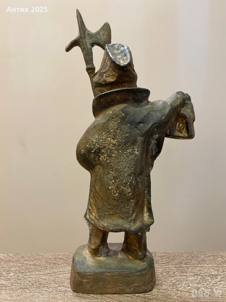 Тежка винтидж статуетка от чугун, изобразяваща мъжка фигура в работно или стражево облекло с алебарда в ръце. Изразителна пластика с добре подчертани детайли на лицето и гънките на дрехите. Повърхността е с характерна естествена патина, типична за чугуна, която подчертава автентичността и възрастта на предмета.