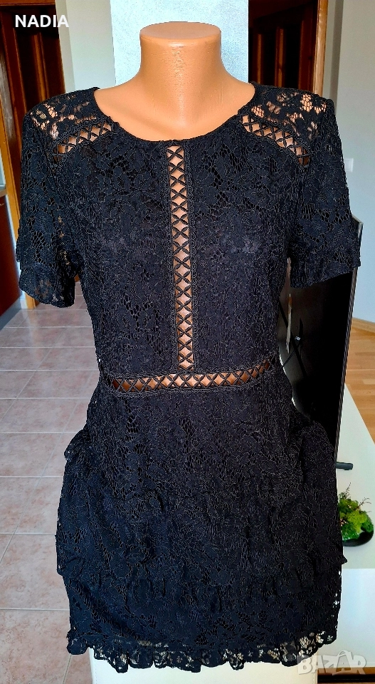 Черна рокля от хубава дантела. Горната част е с ефектни елементи.Долната част е леко А силует, малки воланчита.Дължина 91,от рамо до рамо 42,бюст 50,талия-висока 42,ханш 52.