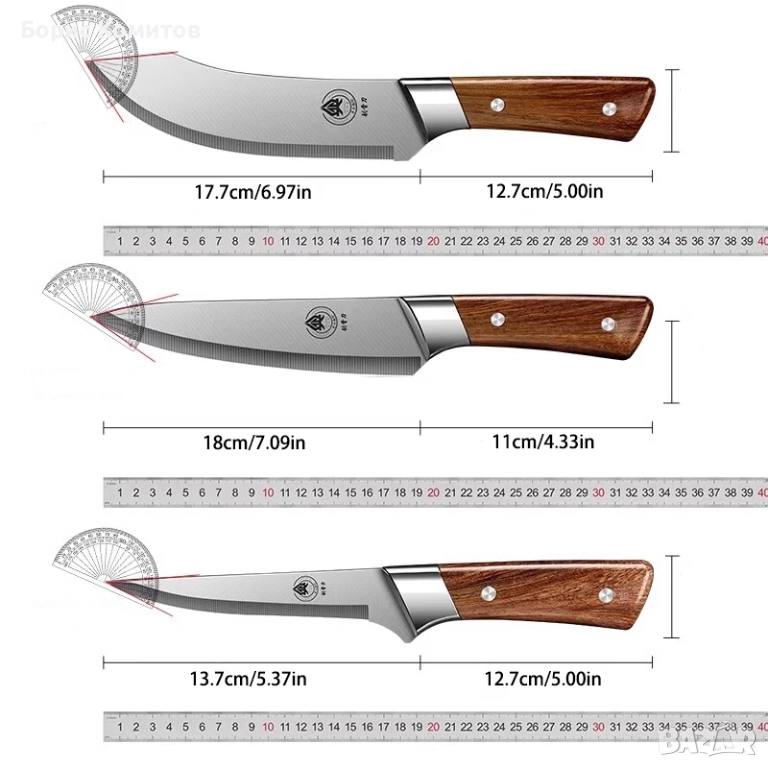 Характеристики: интегрирано тяло на ножа, висока твърдост, устойчиви на корозия остри ножове. Повърхността на ножа със специален процес не задържа лесно мръсотия, лесна за почистване. Краят на дръжката е проектиран с противоплъзгащо покритие.