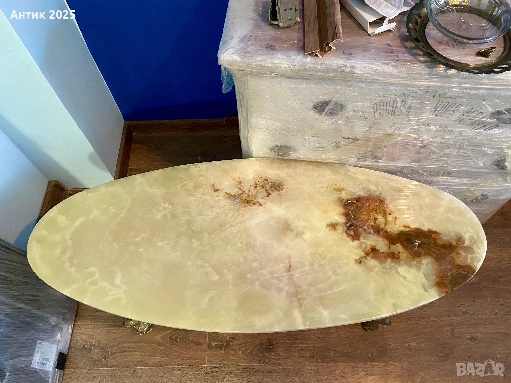 Винтидж холна маса с масивен каменен плот (естествен оникс/мрамор с красиви природни жилки). Основата е изработена от лят метал с декоративно покритие, а краката са свързани с метални укрепващи елементи, които осигуряват добра стабилност.