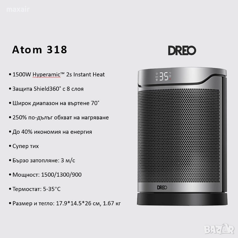 Преносимият отоплителен уред DREO Atom 416 разполага с дистанционно управление, функция за въртене на 70° за максимален комфорт на отопление, керамичен електрически нагревател с термостат с 2-степенна прецизност, позволяващ настройки на температурата от 5 до 35°C за енергийно ефективен комфорт, 12-часов таймер.