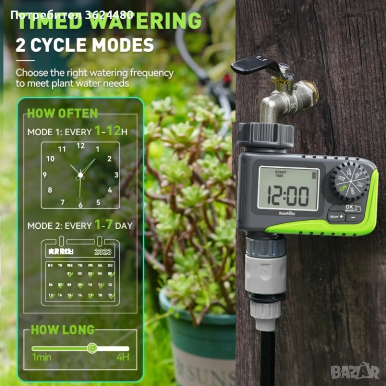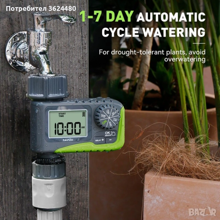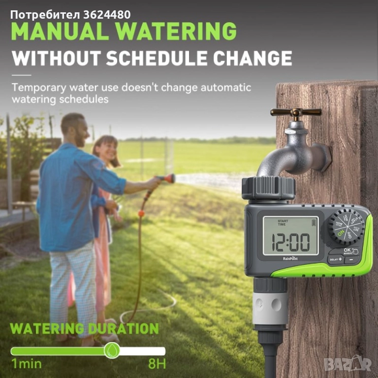 Отличителна характеристика е функцията за забавяне при дъжд (Rain Delay), която Ви позволява да прекъснете насрочения график с едно завъртане, спестявайки вода в дъждовни дни. Можете да програмирате продължителност на поливането от 1 минута до почти 4 часа (3 ч. 59 мин.) и да зададете честота от всеки час до веднъж на 7 дни.