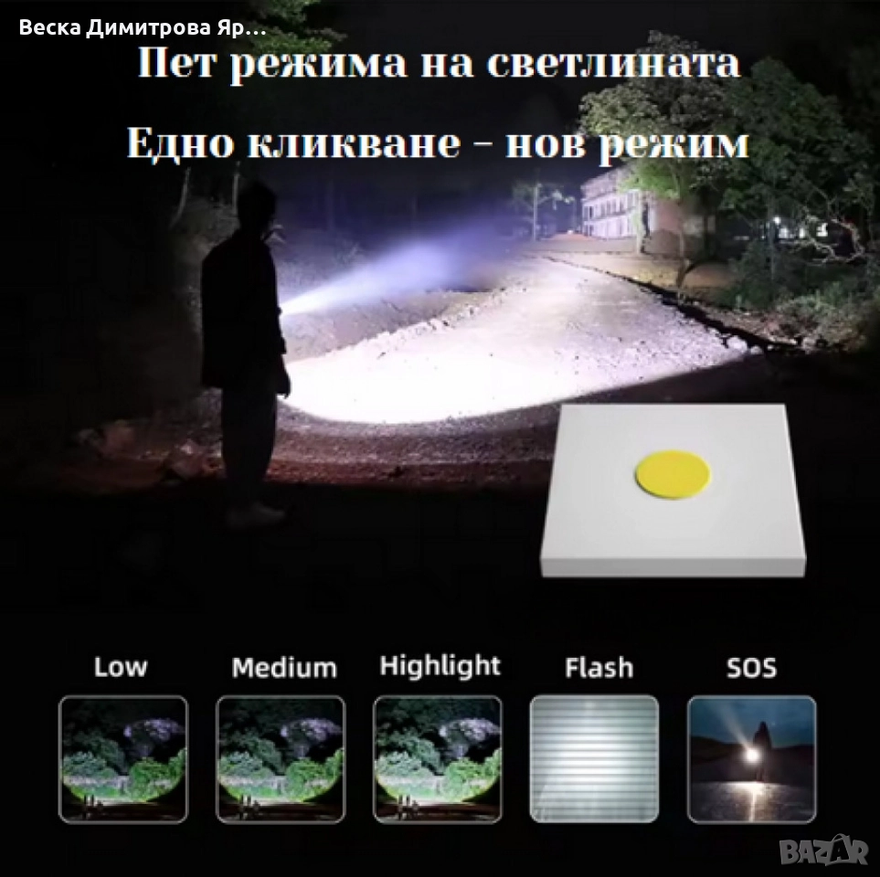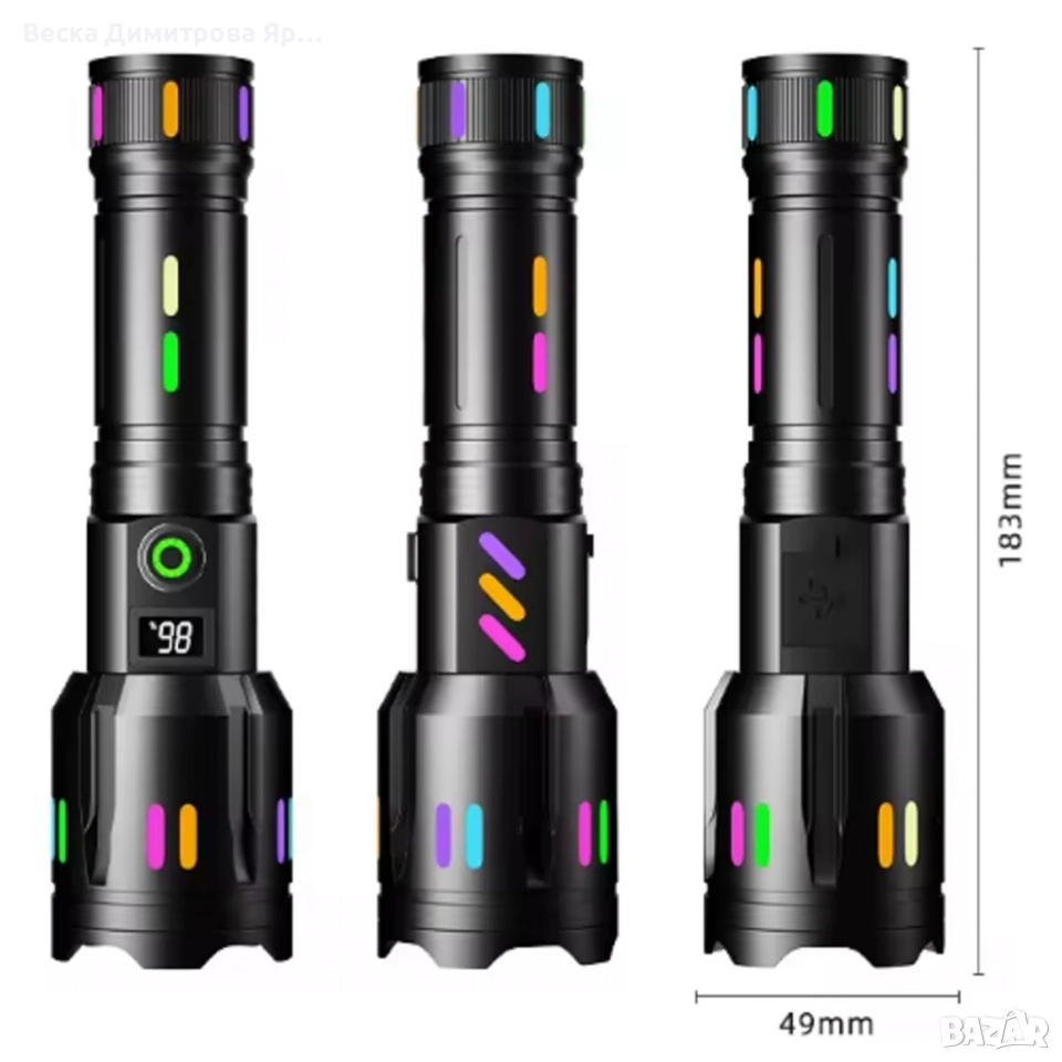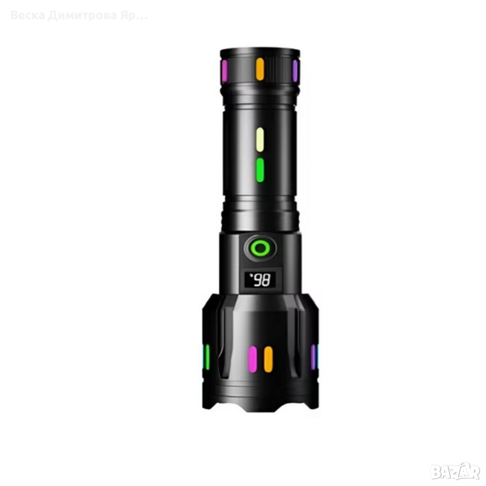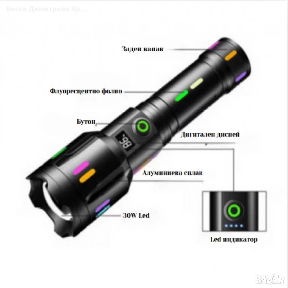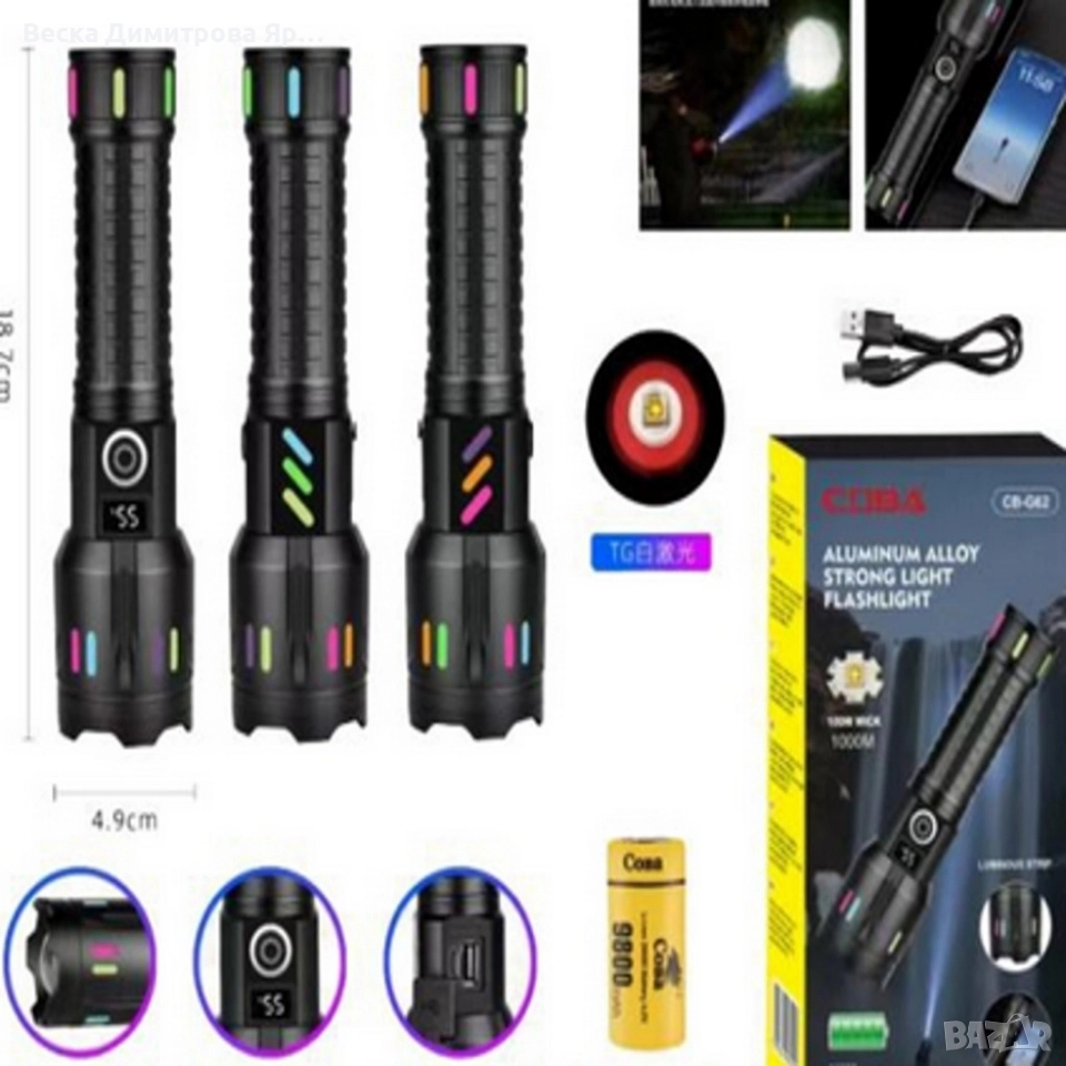 фенер ще реши вашия проблем. С максимален обсег на светлина от 1000 метра и 5 различни режима на работа, той осигурява необходимата мощност и гъвкавост за всякакви условия – от походи в планината до използване при работа на тъмни места. Със своята USB зареждане и компактни размери, този фенер е идеален за всяка ситуация, в която имате нужда от надеждно осветление. Технически характеристики: Размери: 183 х 49 мм Тегло: 250 г Тип осветление: 30W LED Максимален обхват: 3000 метра Режими: 5 режима (ниско, средно, високо, мигащо, SOS) Източник на захранване: USB зареждане Материал: Алуминиев сплав