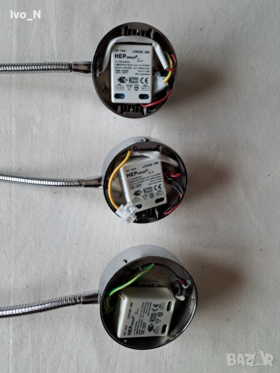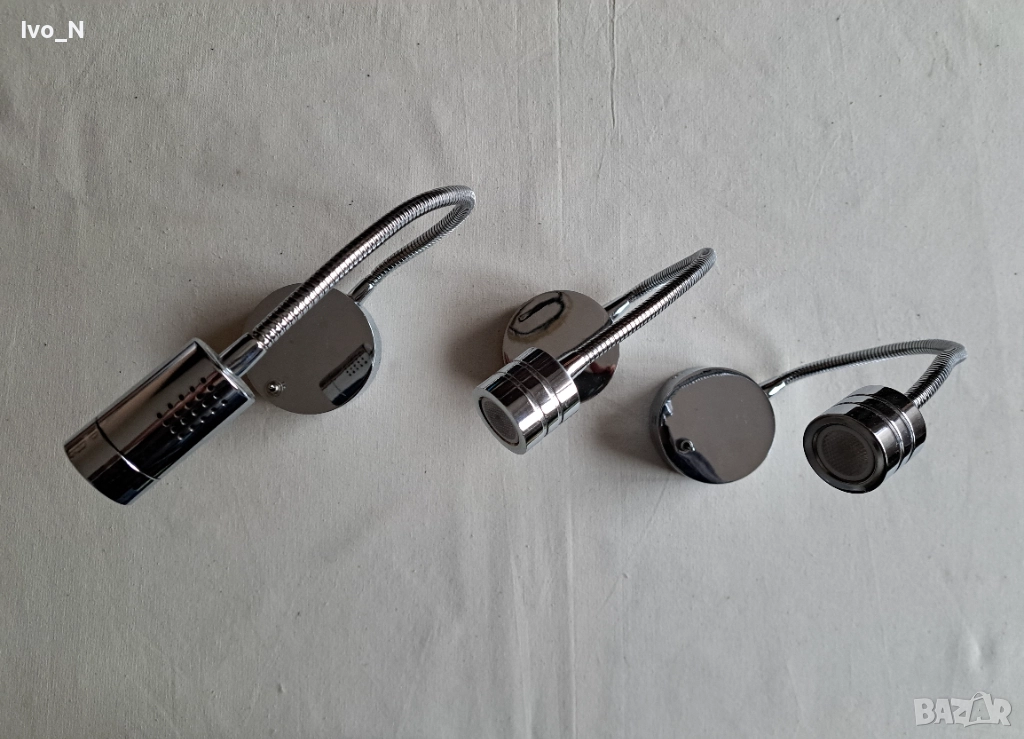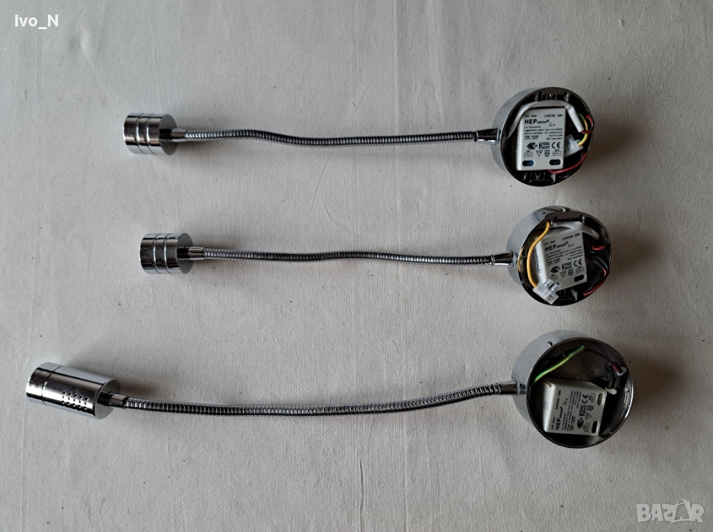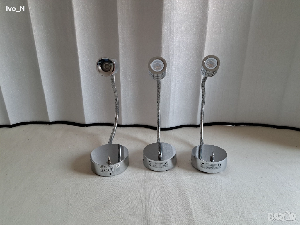 Предлагам три LED лампи с чупещо се рамо в отлично състояние, пробвани са и работят. По принцип са за стена но могат да се ползват и като настолни. Дължина около 40 см. Захранване 230v. Цената е за брой. Цена за трите 35 лв. Изпращам с Еконт с преглед и тест.