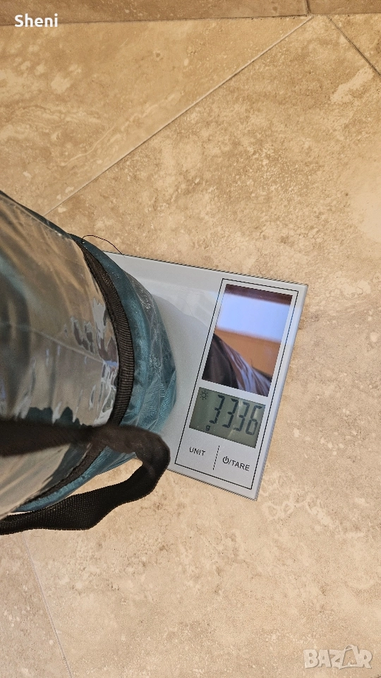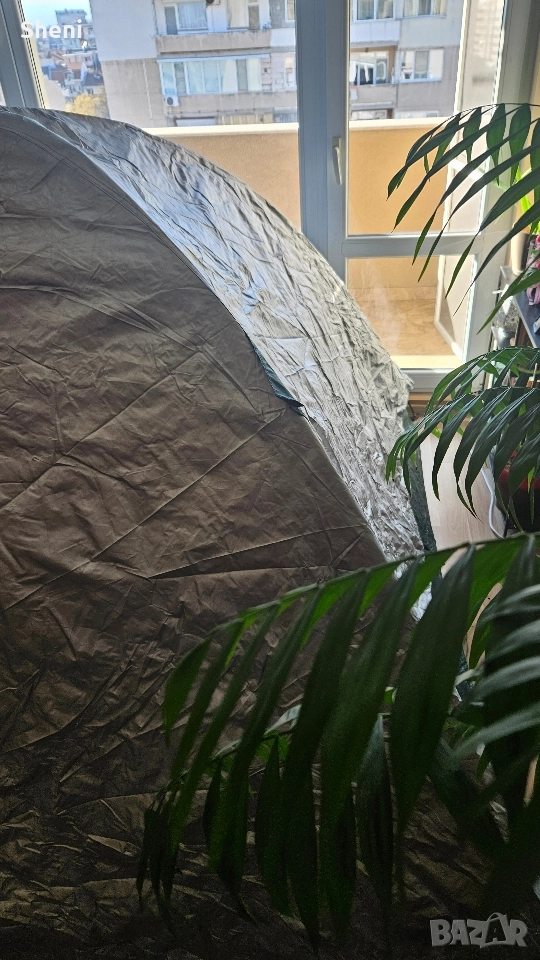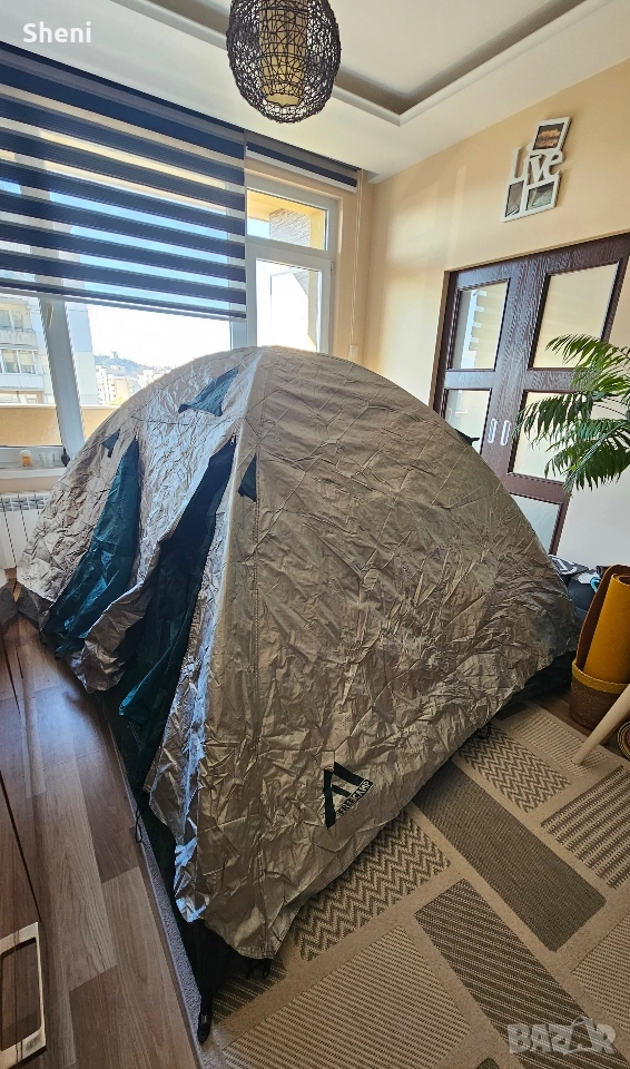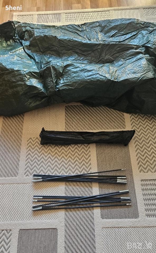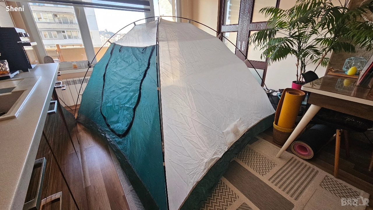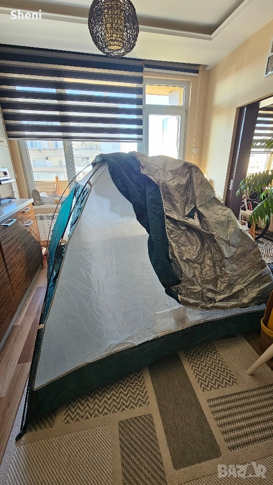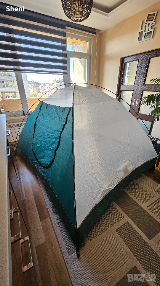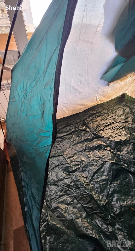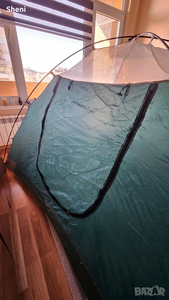Палатка FreeCamp за трима - четирима души с размери 240 х 200 х 152 (Д х Ш х В) Палатката е използвана 3,4 пъти. Тежи 3,3 кг. Всичко в компелтка е налично, включително и телескопичните рейки. Има два слоя. Един с мрежа и един с непромокаема част с две лица. Има предверие с отделни щеки, които се виждат на снимката, но поради ограниченото пространството не можах да ги монтирам. Палатката се разгъва и сгъва за по малко от 4/5 мин.