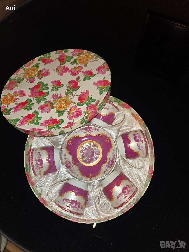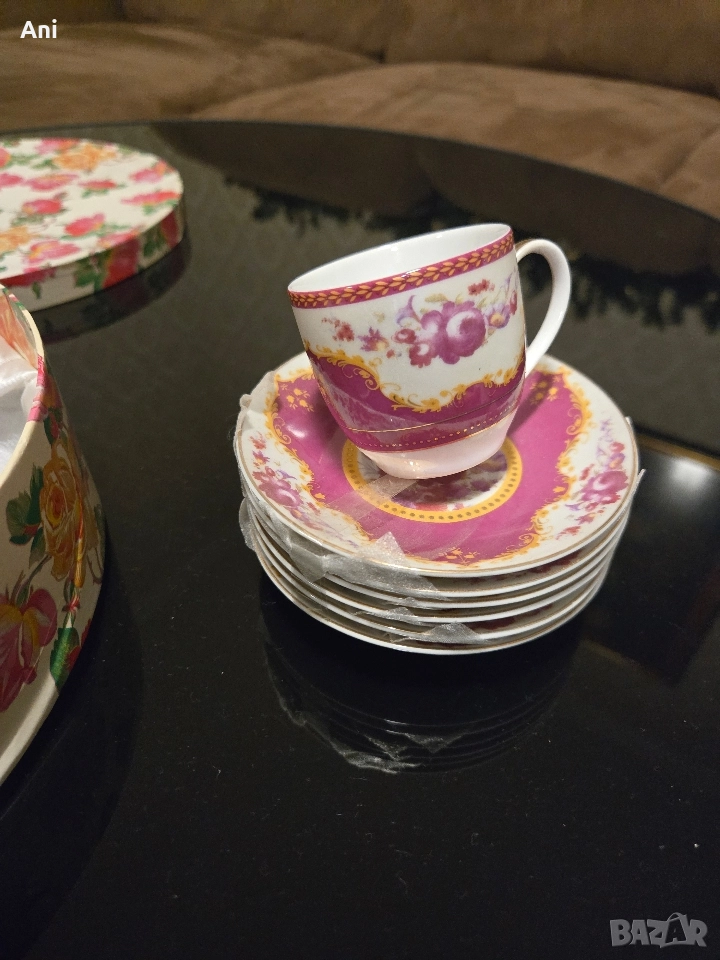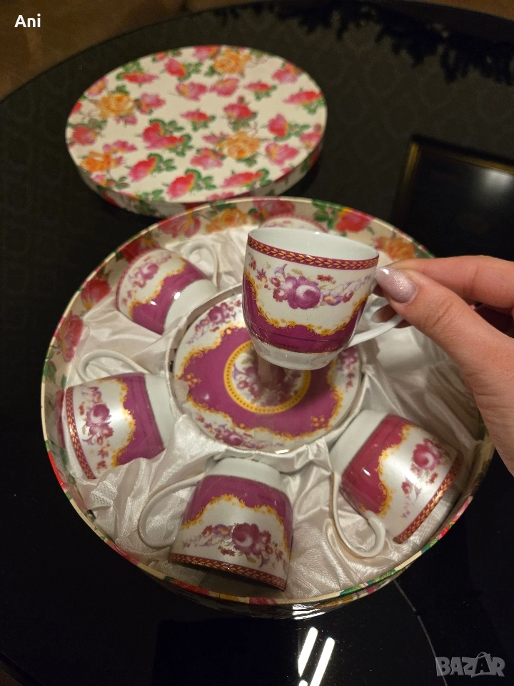 Страхотен и кокетен сервиз за кафе. С 6 чашки и 6 малки чинийки. Чисто ново, перфектно за подарък готово в кутия.