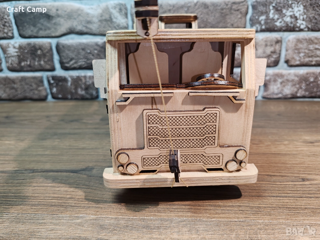 Вярваме, че сме успели да изразим всичко това и в новия ни дървен модел на кран – автокран. Той е изработен изцяло от висококачествен брезов шперплат, като всяка негова част е създадена с изключителна грижа и внимание към детайлите. Покритието от гланцов, безцветен лак на водна основа допълнително подчертава естествения и красив цвят на дървесния материал, придавайки му не само дълготрайна изящност, но и уникален характер.