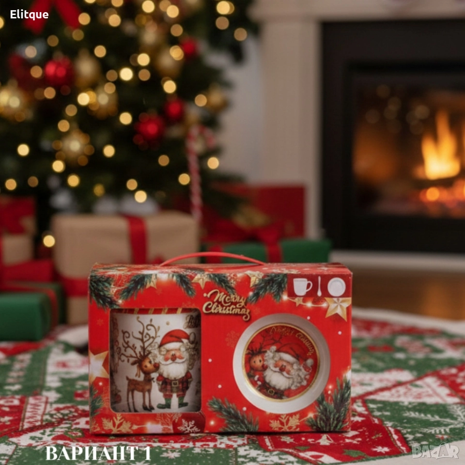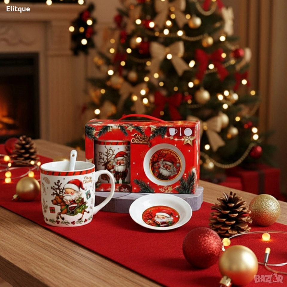 Технически характеристики Материали: Керамична чаша, керамична чинийка, керамична лъжичка; Вместимост на чашата: 350 мл; Размери: Чаша – 8.5 х 9 см; Размер на кутията: Д 19.5 х Ш 8.5 х В 12 см; Цветове: Червен коледен дизайн с Дядо Коледа и еленче; Безопасност: Устойчива керамика, подходяща за топли напитки; Допълнителни елементи: Подаръчна кутия с прозорец и дръжка; Подходящ за деца: Да – без остри елементи; Опаковка: Празнична, готова за подаряване; Възможност за избор: вариант 1, вариант 2;