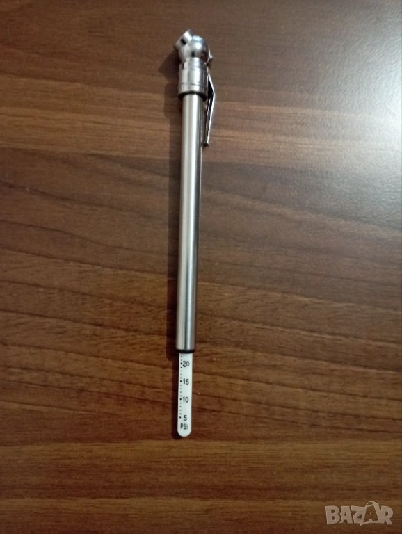 Манометърът е тип писалка. Много компактен и удобен за употреба. Показва точно налягането на гумите.