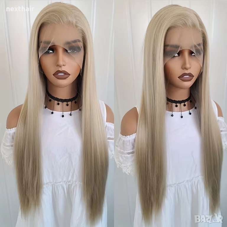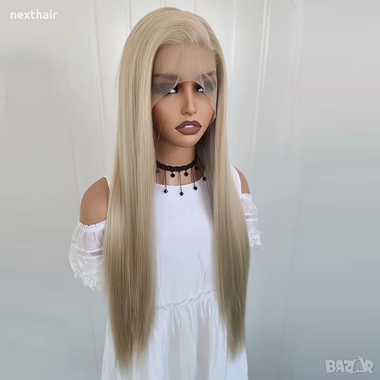 Елегантна дантелена перука тип lace front 13x4 в изискан пепеляво рус цвят, която придава естествен и модерен външен вид. Косата е права, гладка и с дължина около 60 см и малко повече, което я прави идеална за впечатляващи визии както за ежедневието, така и за специални поводи.