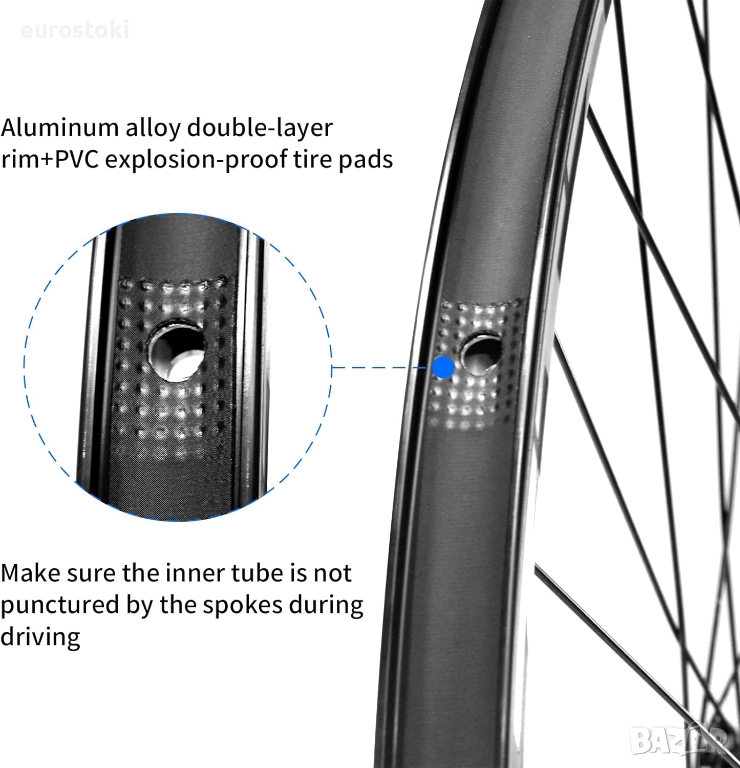 Двуслойната нитована джанта от алуминиева сплав е снабдена с взривоустойчиви PVC накладки за гуми, уверете се, че вътрешната гума не е пробита от спиците по време на шофиране. Доверете се на нашия комплект планински колела за безгрижно велосипедно приключение.