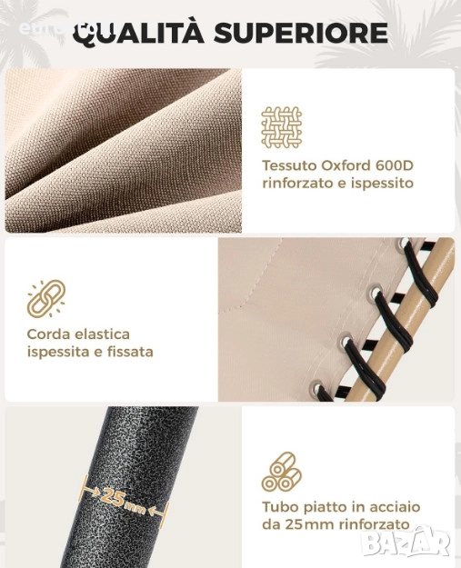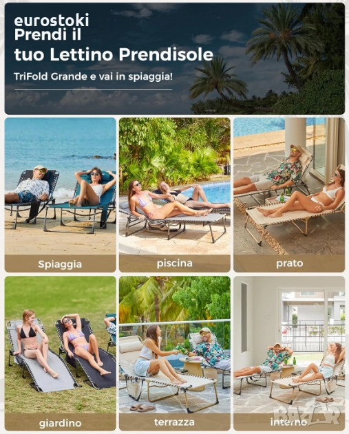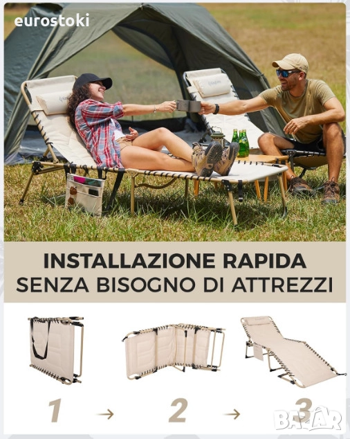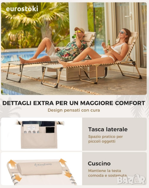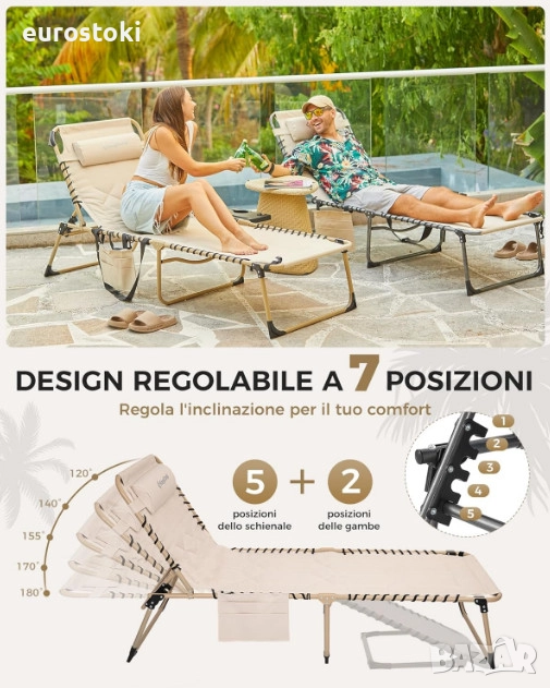 5-позиционен регулируем шезлонг. Облегалката на шезлонга може да се регулира от 90 до 180°, за да отговаря на различните ви пози. Можете да седите, да се отпускате или да лежите, за да се насладите на перфектното изживяване при слънчеви бани. Този шезлонг може да се използва и като плажен стол, къмпинг легло или сгъваемо резервно легло.