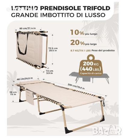Голям сгъваем шезлонг с мек пълнеж. Изключително голям градински шезлонг: 200 x 68 см. Разширеното и удължено къмпинг легло ви предлага голяма свобода на движение. За разлика от други шезлонги, сгъваемият шезлонг KingCamp е снабден с висококачествени ръчно изработени еластични шнурове за закрепване на повърхността за лежане, които се адаптират плътно към тялото ви и ви предлагат пълна опора за ефективно облекчаване на натиска. Средният 1,5 см PU гъбен междинен слой е мек и издръжлив.
