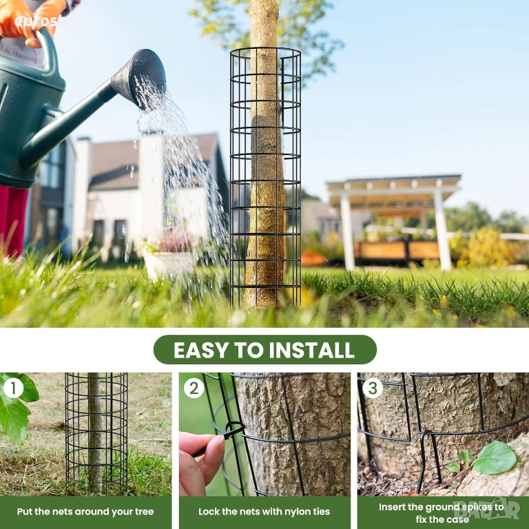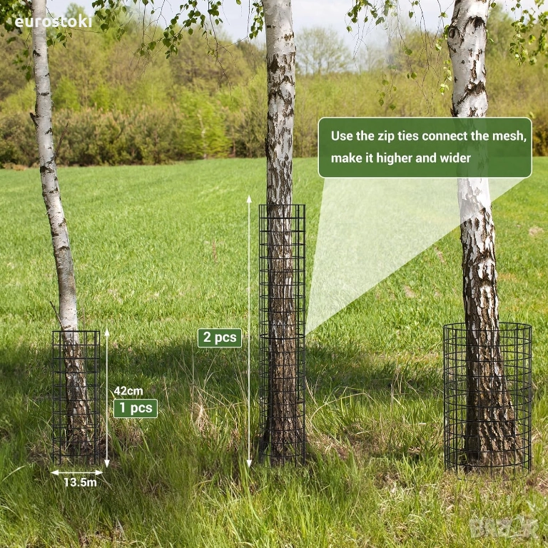 Защитният протектор за ствола на дърветата е изработен от железен материал, който е по-здрав и стабилен от пластмасовите клетки за растения, като ефективно предотвратява яденето на листа и венчелистчета от растения от домашни любимци и помага за защита на стъблата и стволовете на оборудване за тревни площи и градина. Всяка опаковка съдържа 6 защитни корпуса за ботуши, 30 кабелни връзки, 12 заземителни куки.