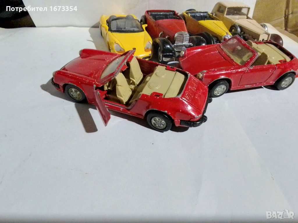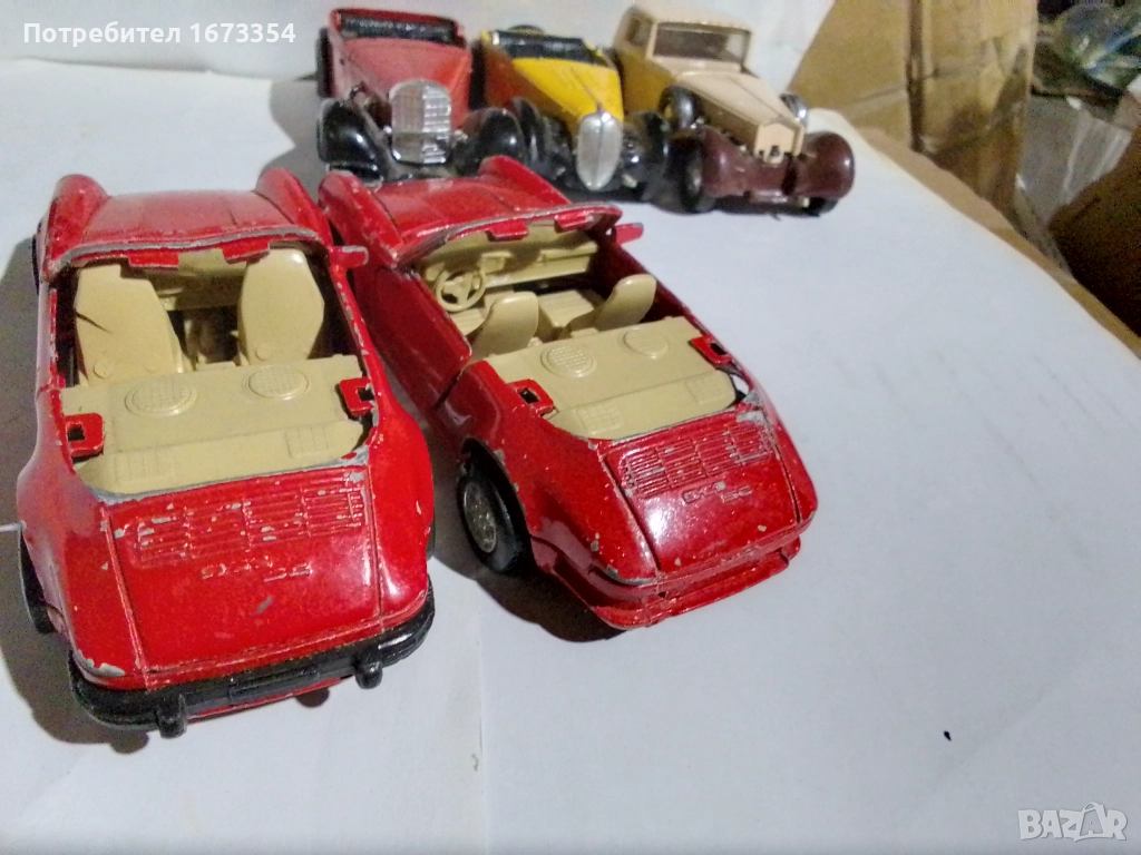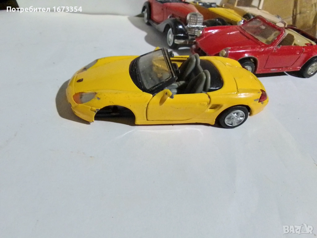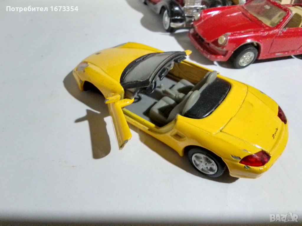 Три броя Порше ( две червени и едно жълто боксер с дефекти и липси,боксера без преден мост).Цена за трите 5.00 евро