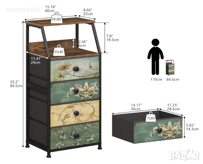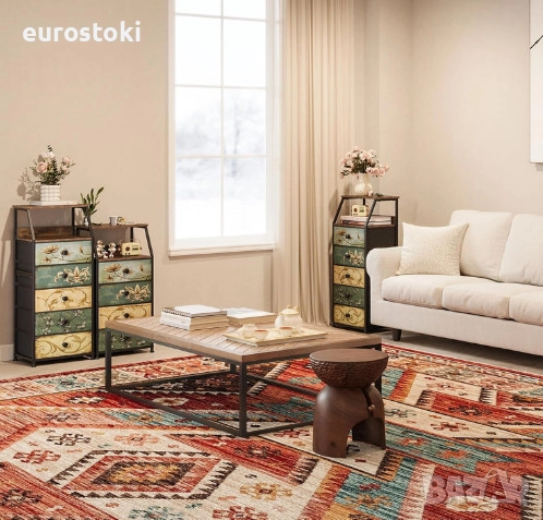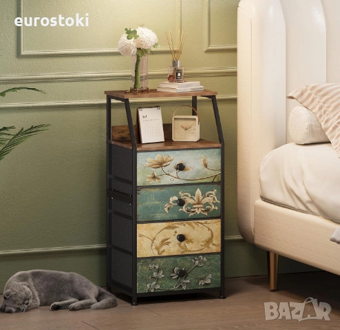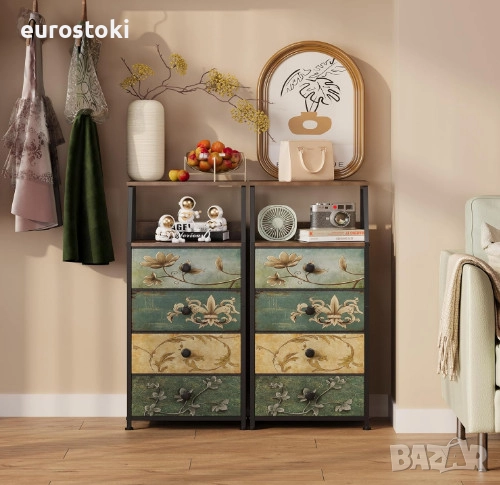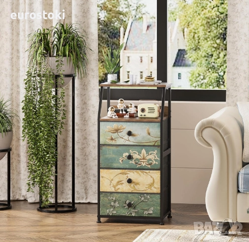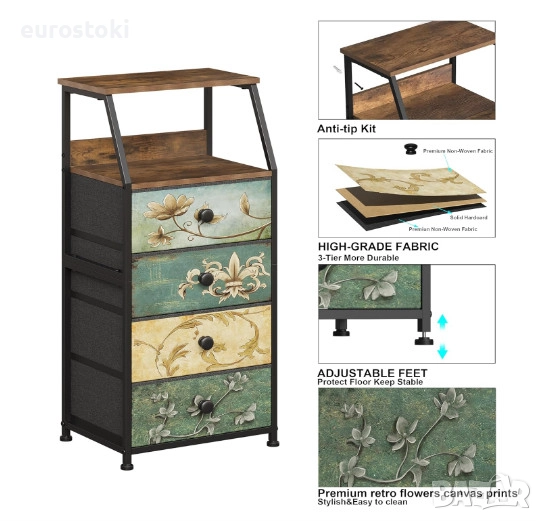 Винтидж дизайн. Винтидж шарките на всяко чекмедже го правят привличаща вниманието мебел, която със сигурност ще привлече вниманието във всяка стая. Този тесен скрин с 4 чекмеджета от плат добавя чар и елегантност към вашето пространство. Тази
