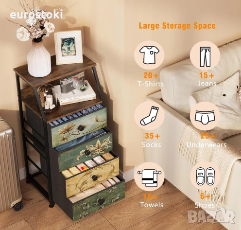 Достатъчно място за съхранение. Размерът на скрина е Д 40 см x Ш 29 см x В 84,5 см. Този скрин предлага достатъчно място за съхранение със своите 4 чекмеджета от плат, което го прави удобен за съхранение на дрехи, играчки, електроника, аксесоари и и всичко, което пожелаете. Дървеният плот и отворен рафт осигуряват твърда повърхност за поставяне на мобилен телефон, лампа, будилник, книги, очила, декорации и др.