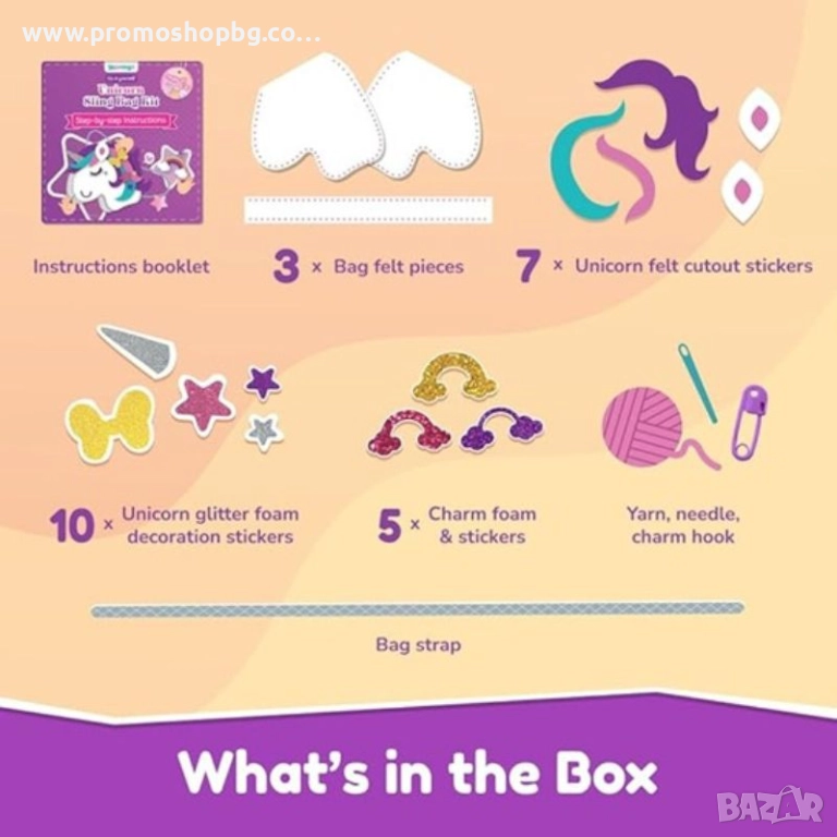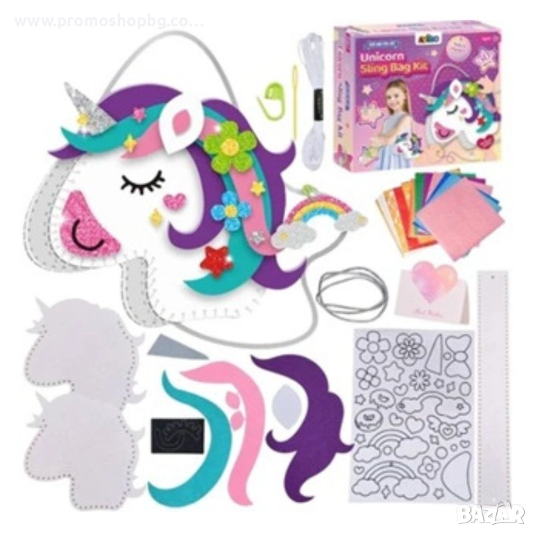 Зашийте, залепете и персонализирайте: Лесни стъпки за зашиване на основата на чантата, поставяне на изрезките за еднорог и декориране с брокатени стикери..