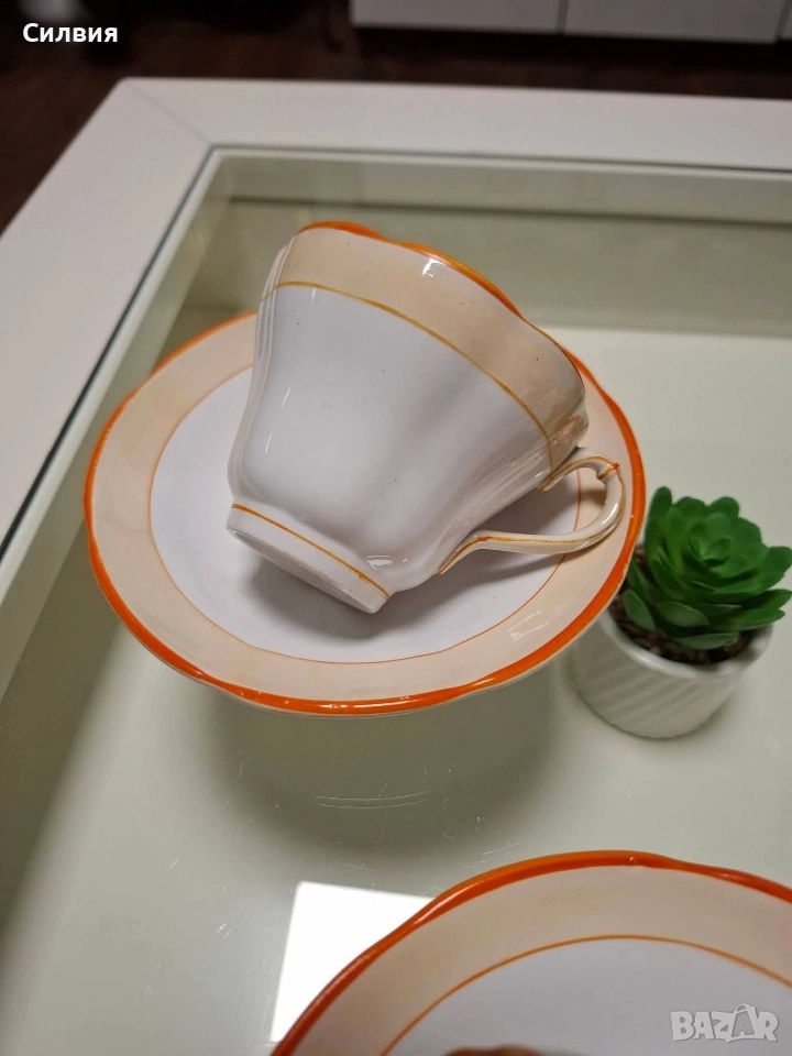 ☕ Антикварни Порцеланови Чаши с Чинийки PETRUS REGOUT MAASTRICHT, Холандия – Модел „Граната“ 🍊 Изключителен комплект от 4️⃣бр. чаши за кафе с чинийки от известната холандска фабрика PETRUS REGOUT MAASTRICHT. Производител: Petrus Regout & Co., Маастрихт, Холандия. Период: Около 1836–1880 г. Модел: „Граната“ (Granata) – елегантен дизайн с ръчно рисувани оранжеви/теракотени кантове. Състояние: Отлично за годините си, (Моля, вижте прикачените снимки.) 📐 Размери: Вместимост на чашата: 150 мл. Диаметър на чинийката: 14 см. 📜 История: Комплектът е прекрасен пример за висококачествения порцелан, произвеждан от Petrus Regout през втората половина на XIX век. Маркировката P.REGOUT.MAASTRICHT е ясно видима на дъното на чинийката (вижте снимката). Идеален за колекционери на европейски порцелан и любители на винтидж интериора. Цена: 1️⃣4️⃣0️⃣лв.71,58 € ೋ🌷 ೋ🌷 ೋ🌷Този старинен комплект за кафе с чинийки от Петрус Регут, чието производство на фаянс се смята за започнало в Маастрихт, Холандия, през 1836 г., се отличава с очарователна, ретро оранжева линия и е произведен между 1836 и 1880 г.