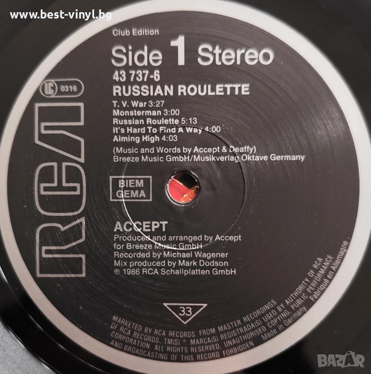 Грамофонна Плоча (Accept - Russian Roulette), снимка 1 - Грамофонни плочи - 52777686 Грамофонна Плоча (Accept - Russian Roulette), снимка 2 - Грамофонни плочи - 52777686 Грамофонна Плоча (Accept - Russian Roulette), снимка 3 - Грамофонни плочи - 52777686 1/3