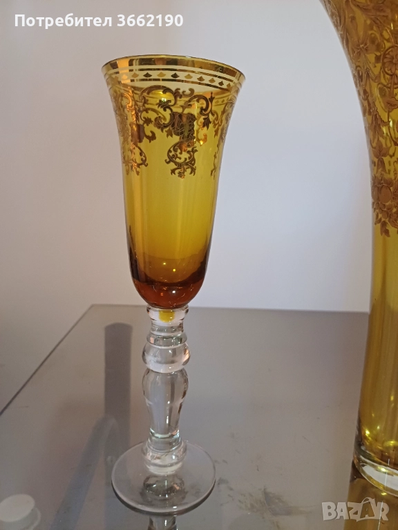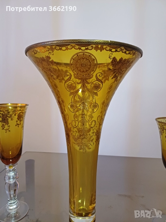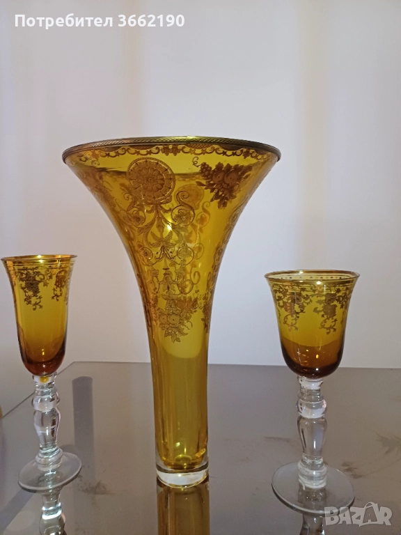 Сет от ваза с нестандартна форма и две чаши за декорация с жълтеникав цвят и златиста орнаментика.Много са красиви, но вазата има отвътре обелване на оцветяването, което не е много видимо.Цената е за трите и е съобразена със забележката.Отлично състояние на чашите - по-високата е 21 см. и широка 6,5 см., другата е висока 19 см. и широка 8 см.Част от лична колекция. Моля, разгледайте и другите ми обяви!