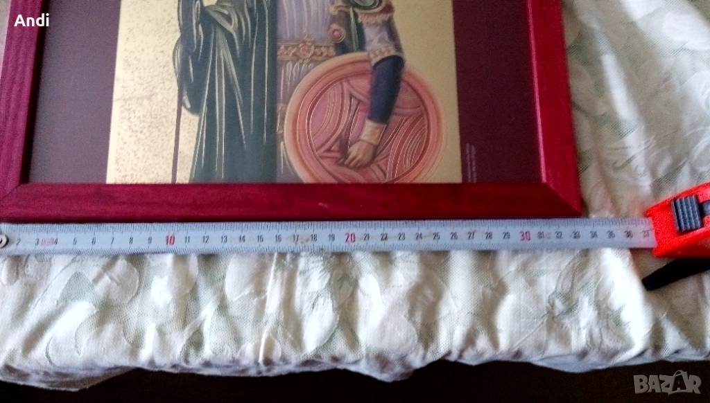 Продавам икона на Свети Петър, иконата е с дървена рамка със стъкло - репродукция. Размери: 34 х 27см. Картина на Свети вм. Мина , рамката е с дървена цвят махагон.