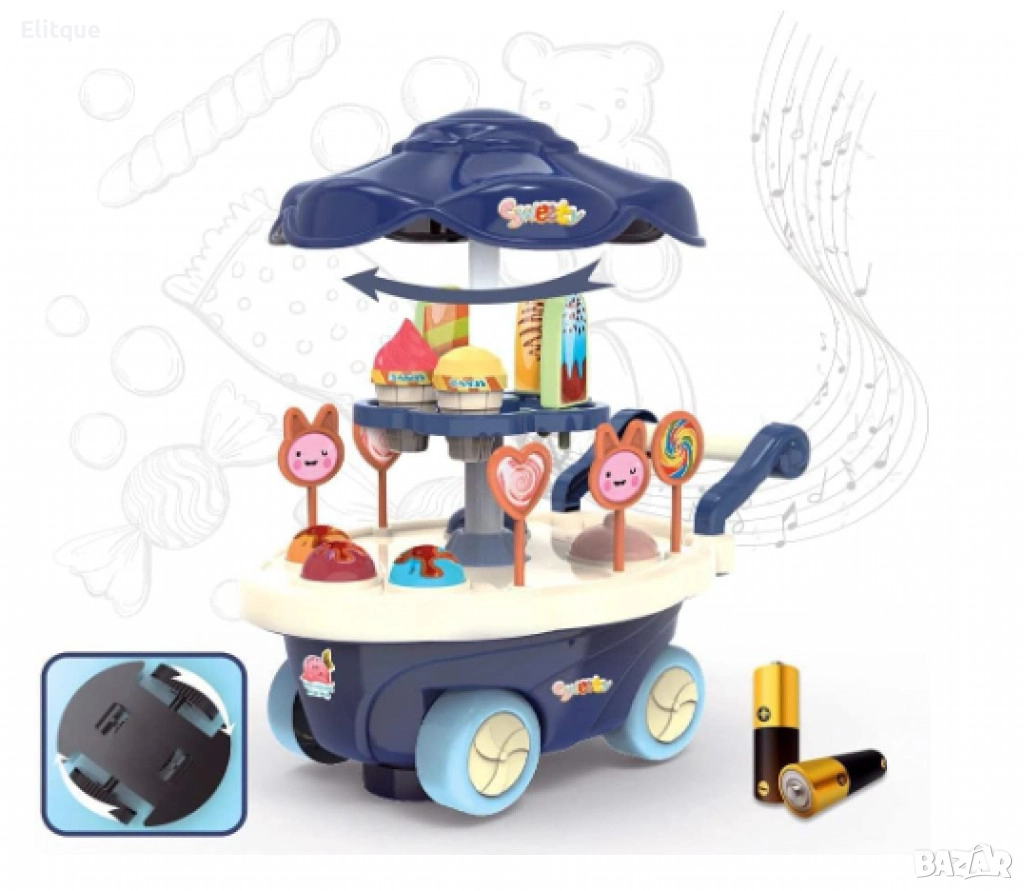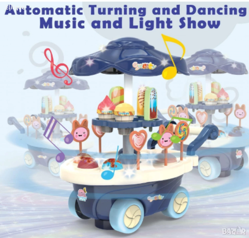 Детската количка със сладкиши и сладолед е забавна и цветна играчка, която ще зарадва всяко дете. Тя е с въртящ се механизъм на 360 градуса, което я прави още по-интересна за игра. Количката е оборудвана с музика и светлини, които допринасят за по-голямото забавление. Размерите й са 10 х 25 х 23 см, което я прави удобна и лесна за манипулиране от малки ръчички. Изработена е от безопасни материали, подходяща за деца над 3 години. Сладките аксесоари в количката включват различни сладкиши и сладолед, които ще стимулират въображението и креативността на детето.