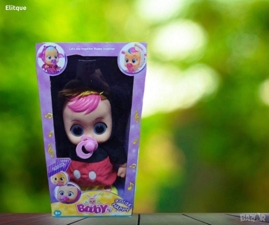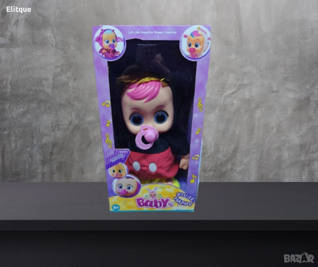 Плачещо бебе с биберонче, музикално е интерактивна детска играчка, която имитира реалистично поведение на бебе. Когато натиснете биберончето в устата му, бебето започва да плаче и може да бъде успокоено със звук, наподобяващ успокояваща песен или мелодия.