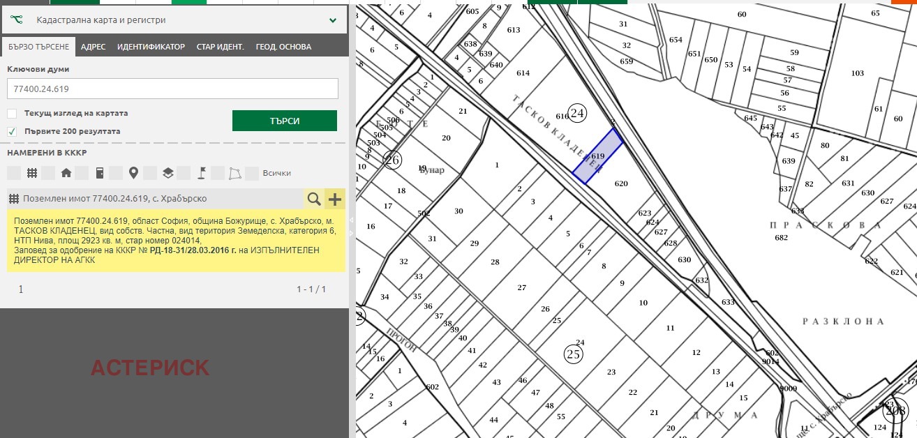 Поземлен имот 77400.24.619, област София, община Божурище, с. Храбърско, м. ТAСКОВ КЛAДЕНЕЦ, вид собств. Частна, вид територия Земеделска, категория 6, НТП Нива, площ 2923 кв. м, стар номер 024014,