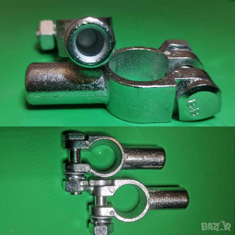 Клемите са от никелиран месинг, максимално компактни, изключително здрави и дебели. Месинга не корозира, но въпреки това имат и слой никел. За стандартен EU акумулатор. Ако искате да стават за японски стандарт, имам нужните удебелителни оловни ламаринки, за допълнително 5лв комплекта.