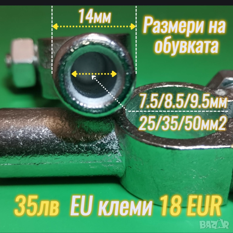 Тези клеми са за 25, 35 и 50 квадрата кабел, според изискванията на купувача. Вътрешния диаметър на обувката е различен. Тоест за различни дебелини на кабела. Могат да се поръчват по отделно или смесено. Могат да са комплект от положителна и отрицателна клема или единично. Може да ги кримпнете, запоите или и двете за още по-добър контакт и непроницаемост. Най-лесно е само със запояване, като съм предоставил клип, за да видите как се прави. Стават идеално за морски цели, тъй като са херметични и издържливи на корозия. Обувката за кримпване е мега яка и дебела! Като ги подържите в ръката си, ще разберете. Заспиват перфектно до дъното на климите на акумулатора! Не са тесни, не са широки, а точни! Вътрешния отвор има същия лек наклон, който съвпада идеално с клемите на акумулаторите. Не просто цилиндрични, като евтините боклуци.