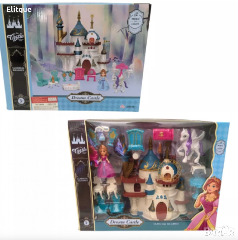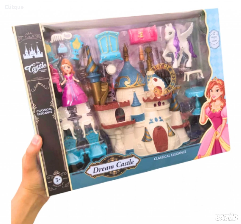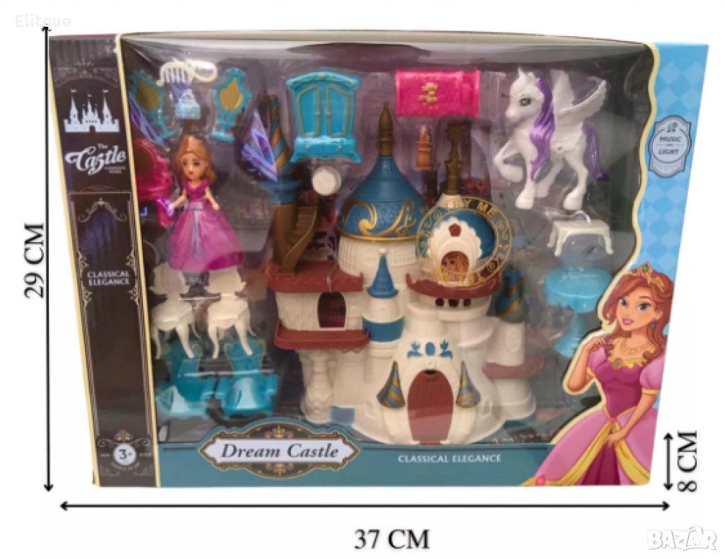 Този магичен музикален замък за принцеси е идеален подарък за всяко малко момиче, което мечтае за чудесен свят, изпълнен с вълшебства! Комплектът съдържа 18 части, включително замък, столове, фотьойли, кукла, пегас, огледало и чанта. Всеки елемент е внимателно изработен с детайли, които създават вълнуваща атмосфера.