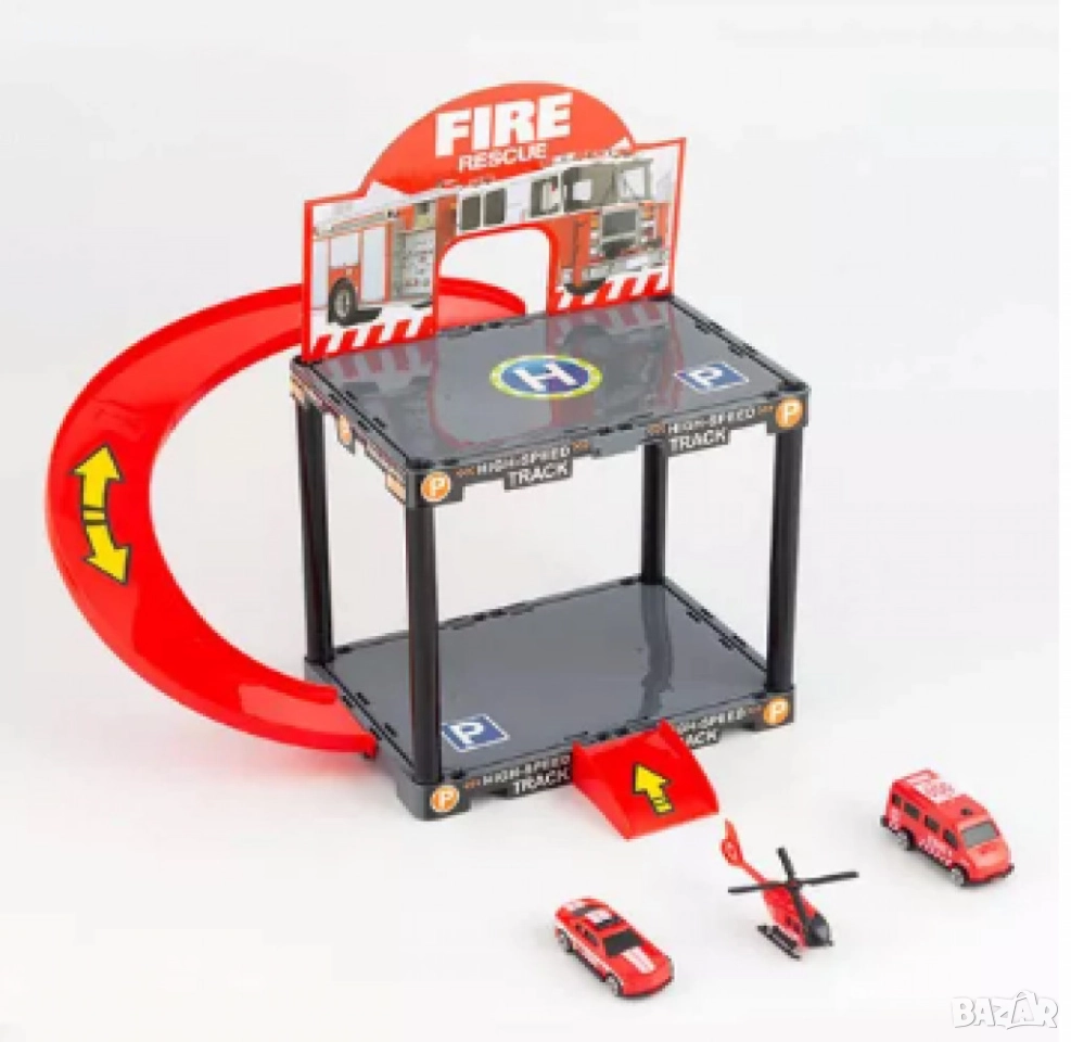 Този комплект за игра включва всичко необходимо за вълнуваща игра с тематика пожарна безопасност. Комплектът съдържа паркинг с много нива, две пожарни коли и въртолет, които могат да се използват за бързо реагиране при бедствия.