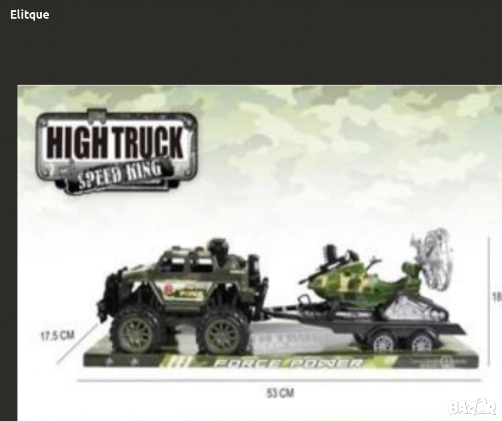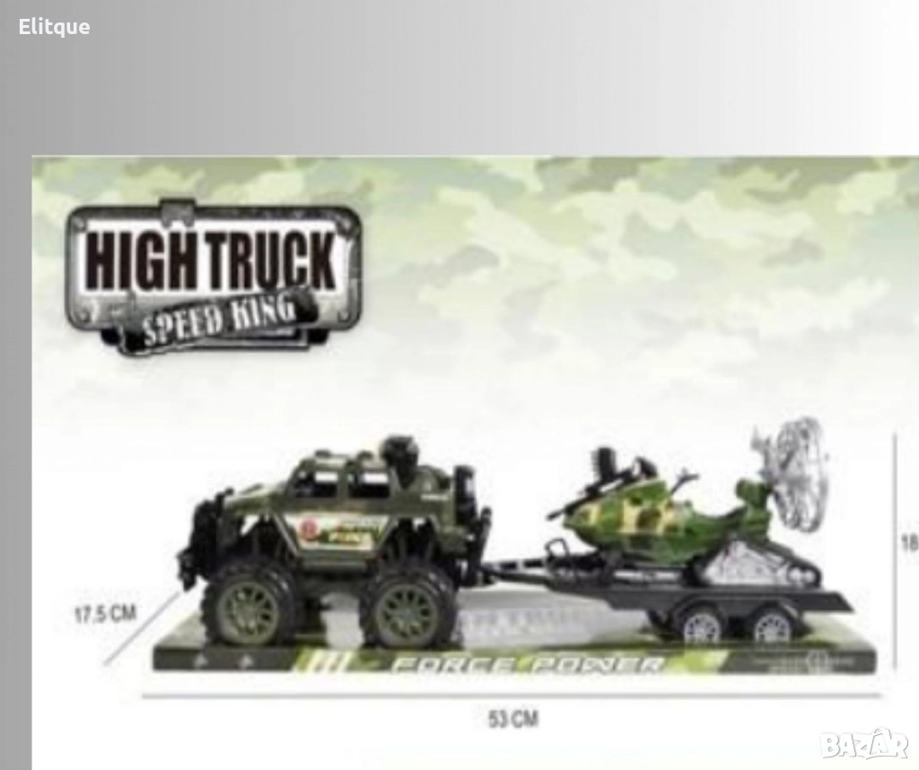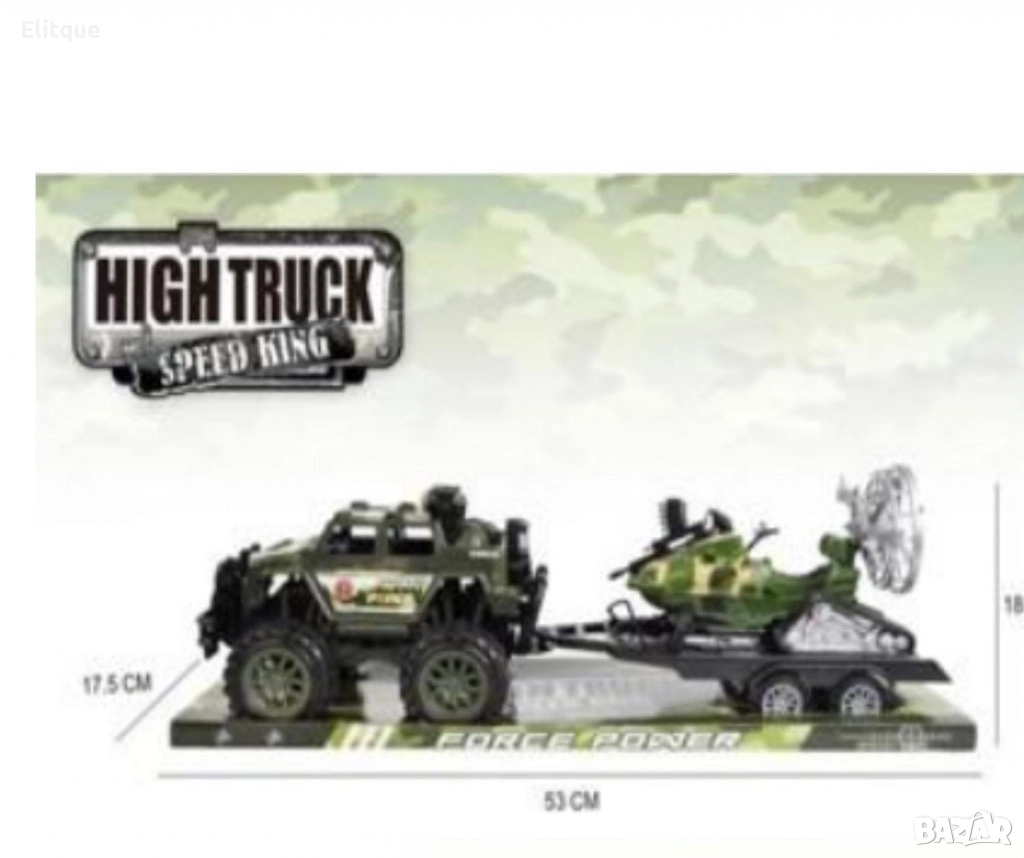 Този комплект играчки включва военен джип и превозно средство, които са прикрепени към ремарке. Подходящ е за деца, които обичат военни теми и приключенски игри.