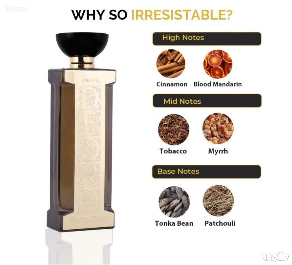 Базови нотки: Пачули, зърна тонка – завладяващ завършек, който остава траен и съблазнителен;