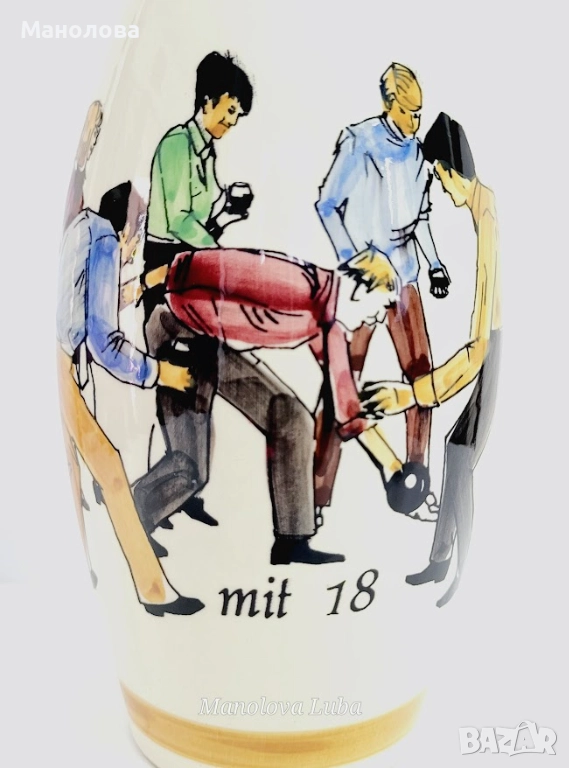 Порцеланова бутилка във фирмата на боулинг кегла, произведена в Германия през 70-те години на миналия век. Лимитирана серия Jacobi 1880 VSOP. Надписът гласи: "Seit 1880 mit 18 und mit 80", което на немски означава: „От 1880 г. с 18 и с 80“ и е рекламният слоган на марката. Маркировка на дъното: Mind. - Inh. 0,7 л.