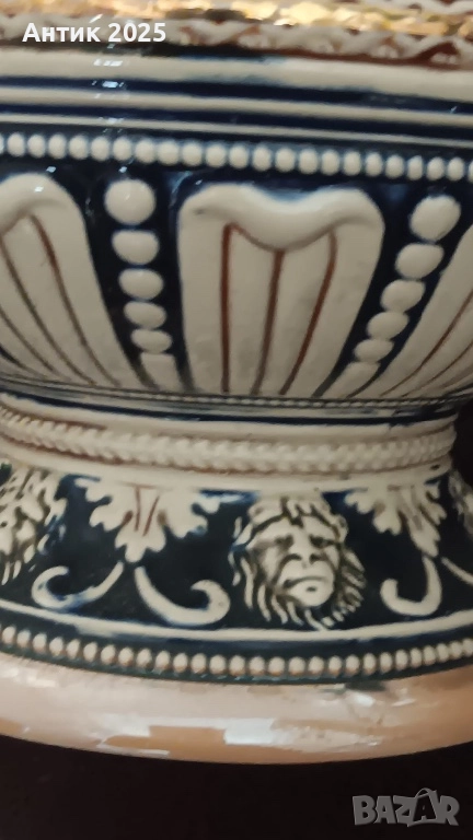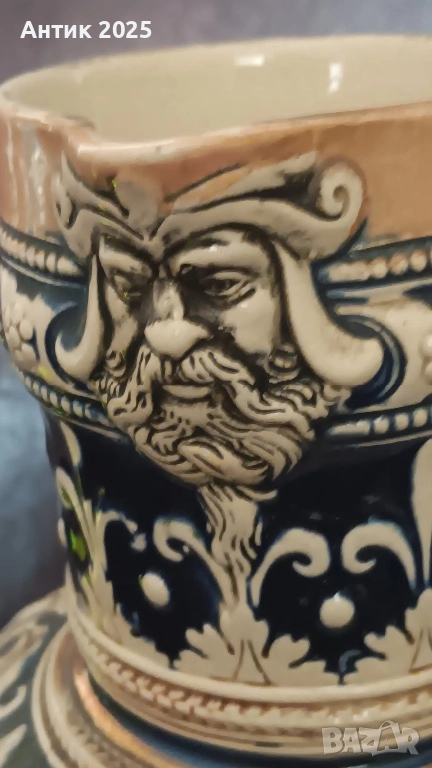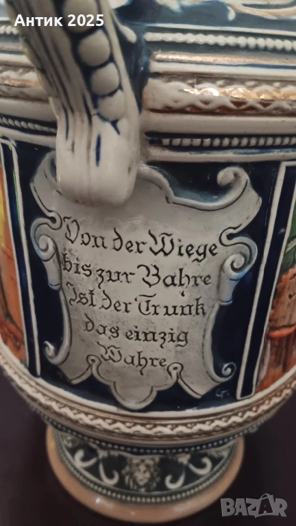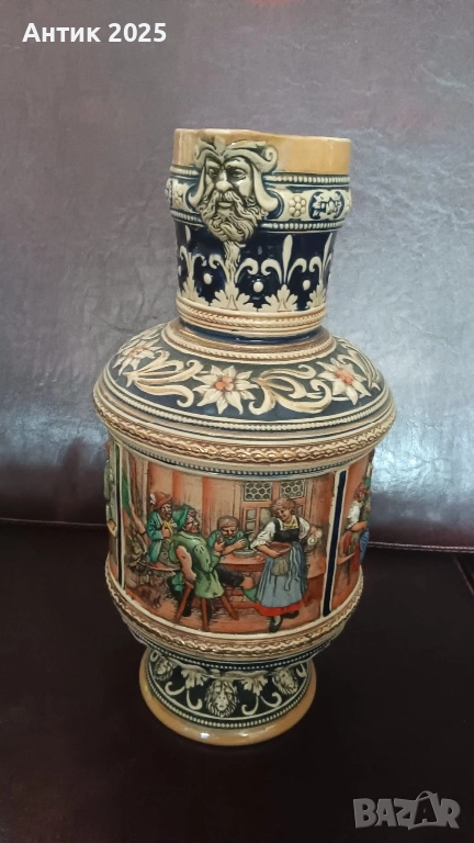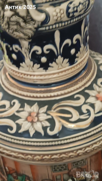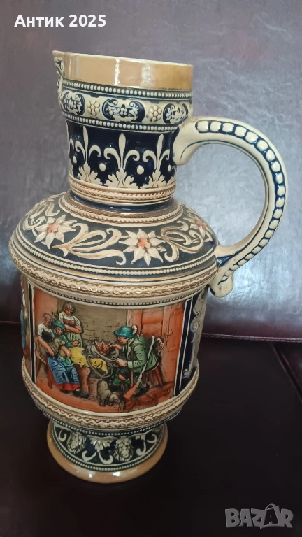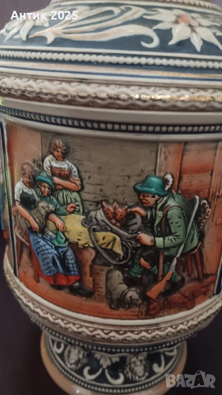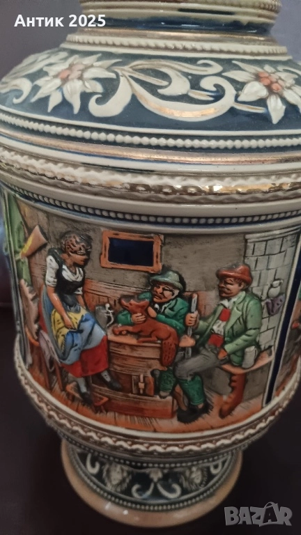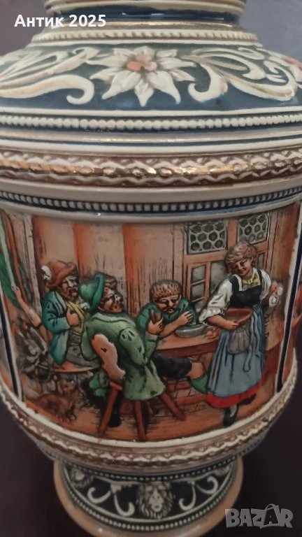 Голям декоративен бирен халбe от немско производство, изработен от керамика с богата релефна декорация и многоцветна ръчна рисунка. Върху корпуса е изобразена жанрова сцена в традиционен немски стил (кръчмарски сюжет), както и орнаментални пояси и класически мотиви, характерни за германските щайнове.
