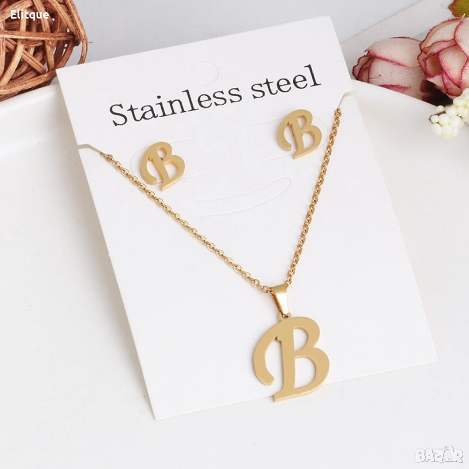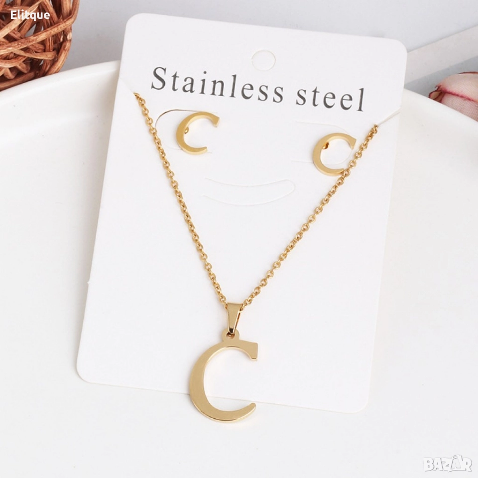 Фино и елегантно дамско колие, направено от неръждаема стомана и златно покритие. Предлага се с висулка буква от английската азбука, както и 2 по-малки букви тип щипки. Налични са със всички 26 букви от английската азбука.