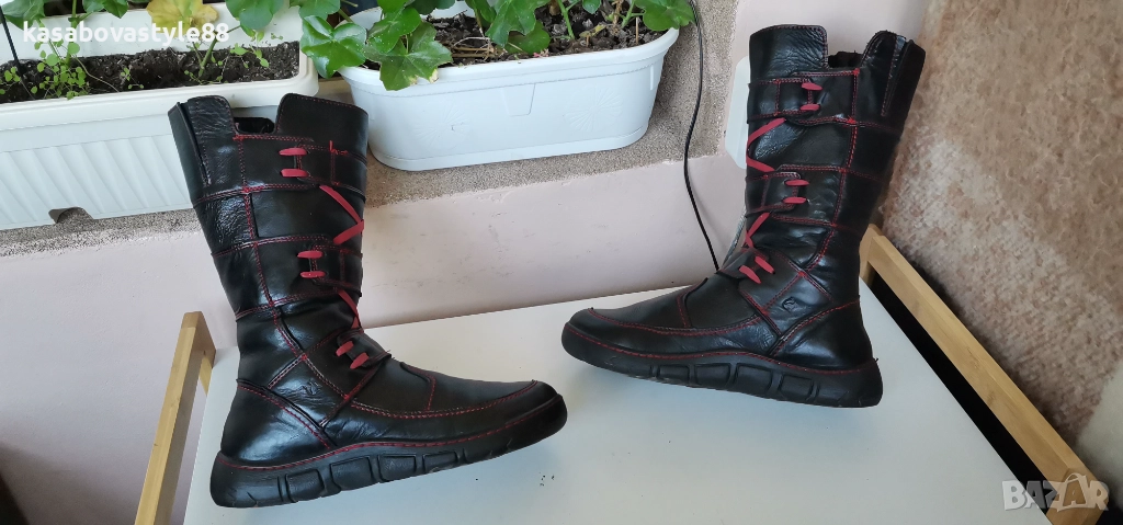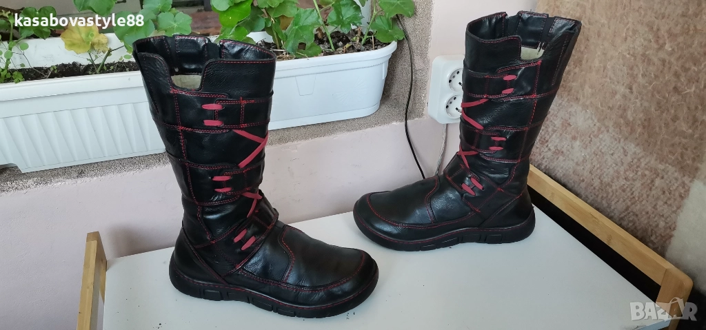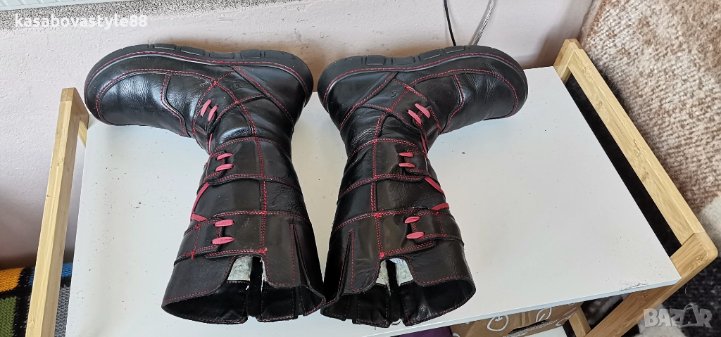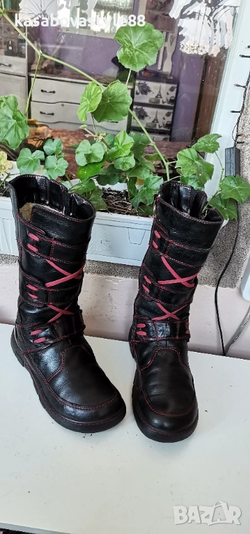 Ботушите са 100%оригинални!!Изцяло запазени, перфектни отвътре и отвън. Лицевата част е направен от естествена кожа с червени връзки, а отвътре са с топла натурална вълна,която изолира от студа. Те се отличават със своята издръжливост и качество. Леки и ултра еластични откъм подметката и комфортни. Имат дискретни ластици откъм прасеца. Дължина на стелка 24.9см.Цялостна височина отзад 31см.Ходило 3.5см.а в страничната 3 см.