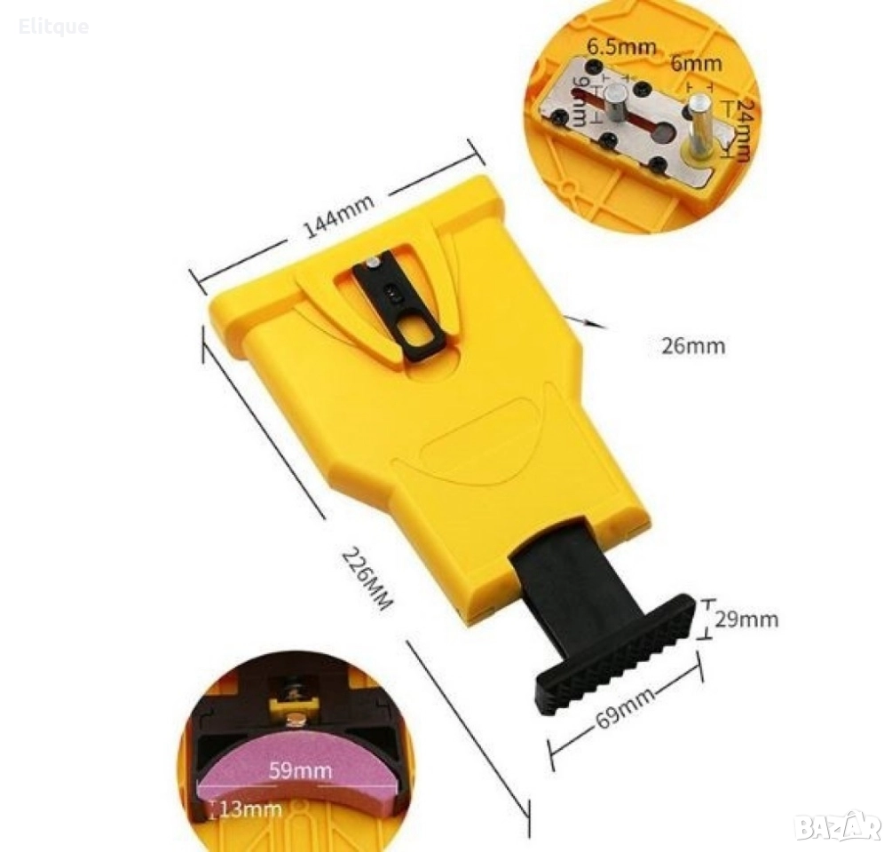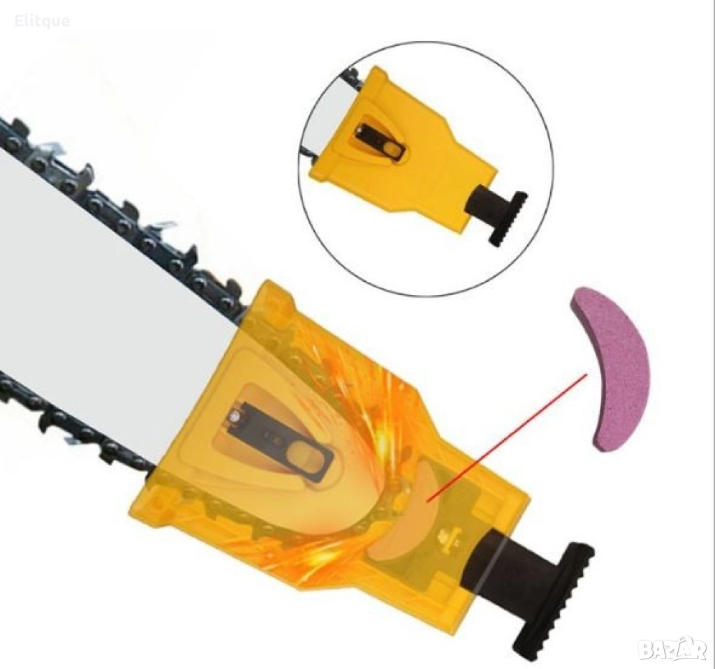 Компактна острилка за бързо заточване на верижен трион / Материал на изработка: първокласна висококачествена ABS пластмаса; 2 отвора за фиксирано заточване – единият фиксиран, а другият се движи напред-назад; Подходящ за вериги 14