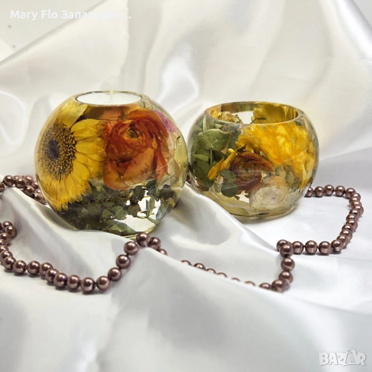 Изящните форми са ръчно изработени с истински гербери, фрезия и други нежни цветя, запазени в кристално чиста смола. Когато запалите свещ, топлият пламък преминава през листенцата и създава мека, магическа светлина, която изпълва стаята с уют и позитивна енергия.