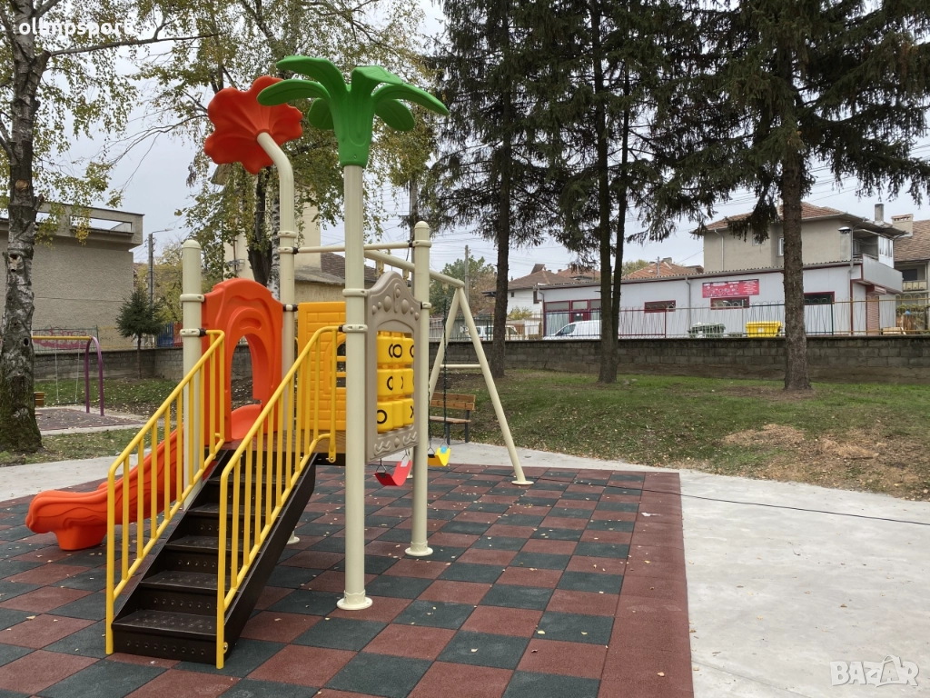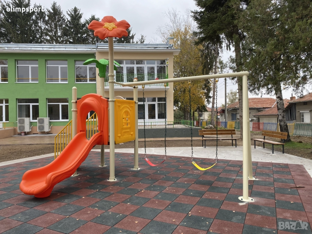 Комбинирано детско съоръжение Цвете – люлка – пързалка – игра морски шах – размери Д/Ш/В – 512/285/370 см – височина на свободно падане – 1,3 м – използвани материали – за колоните – поцинковани и прахово боядисани стоманени профили ф115 мм, за пързалките, покрива и декоративните елементи – висококачествена пластмаса.