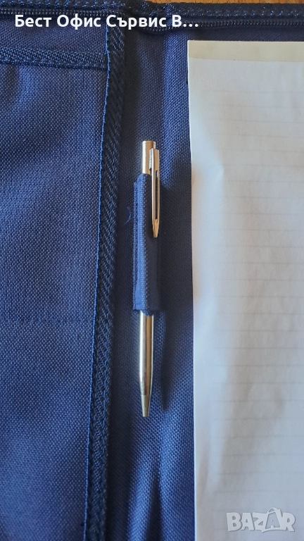 Продавам папка луксозна за документи с цип синя размер A4. Има 4 джоба за визитки и документи. Единият от джобовете може да се затвори с цип. Има метална химикалка, която пише с пълнител тип "крос". Бележникът за писане с редове е с размери 21x29.3 и има 10 листа. Размер на папка 25x33x2 cм. Чисто нов. От частна колекция. За ценители.