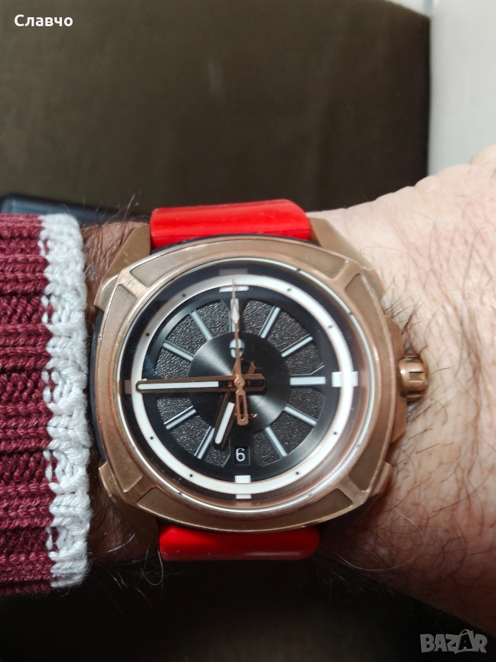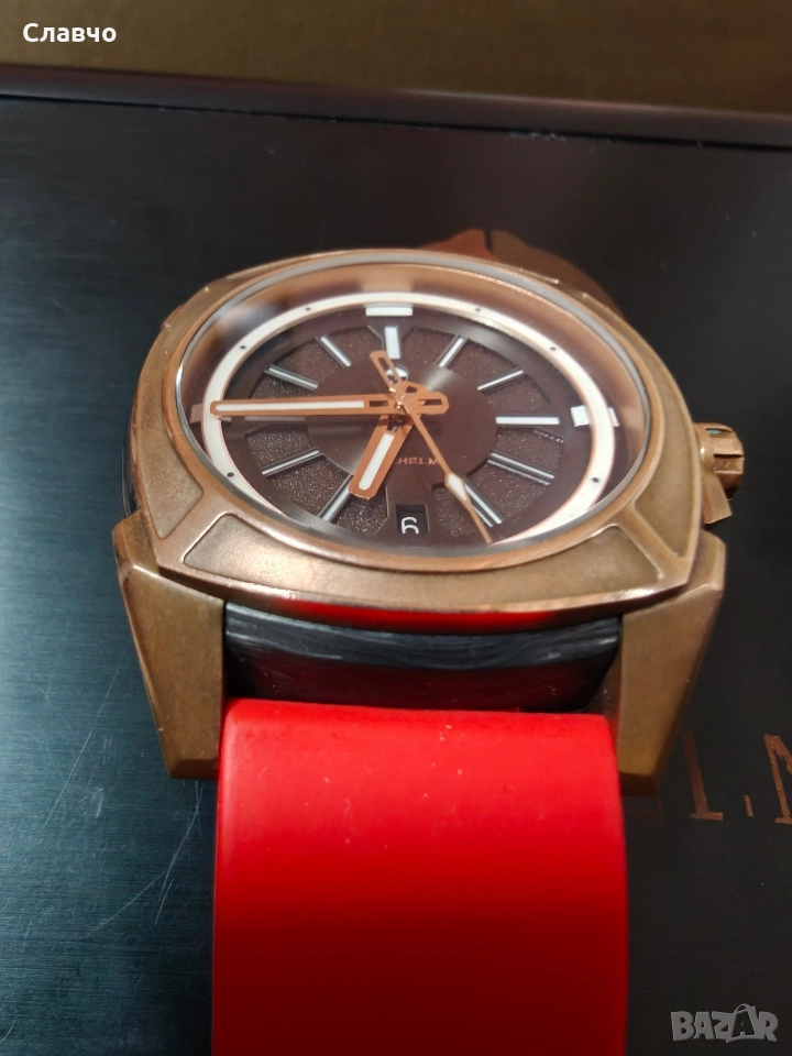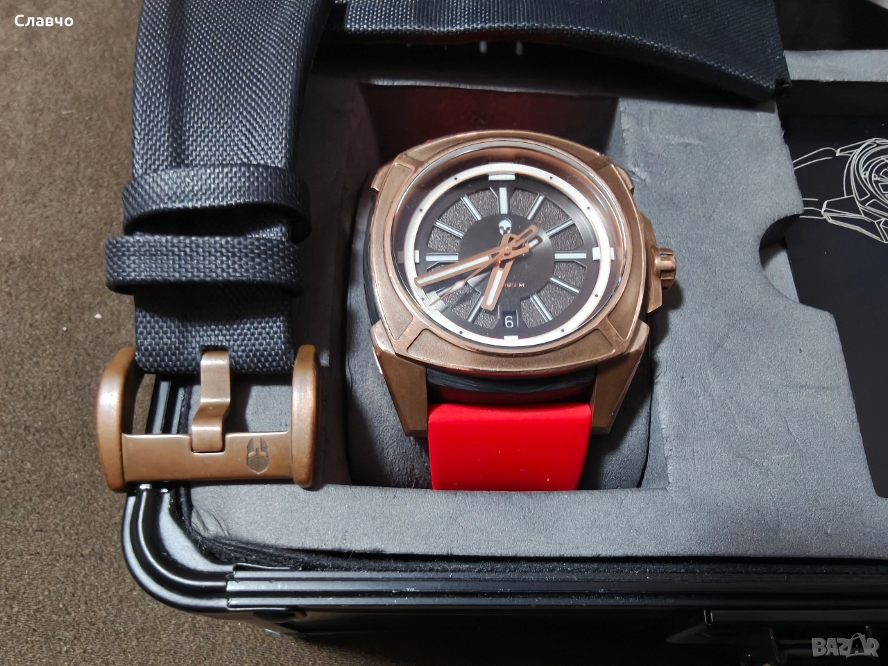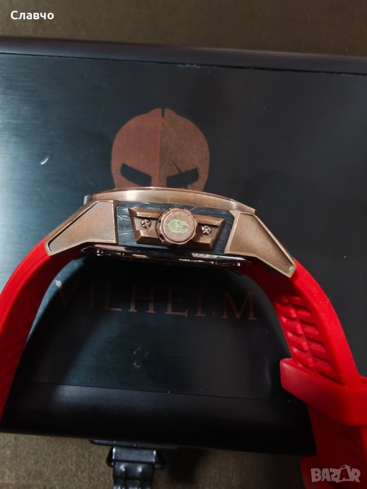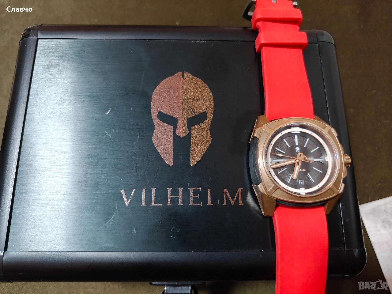 Коледна цена! Vilhelm Talos Bronze Diver. Характеристики на часовника Марка: Vilhelm Модел: Talos Материали на корпуса: Комбинация от бронз CuSn8 и кован въглерод Механизъм: Швейцарски автоматичен механизъм Sellita SW200 Водоустойчивост: 500 метра Стъкло: Сапфирен кристал с антирефлексно покритие Диаметър на корпуса: 43 мм Каишка: Обикновено идва с няколко каишки, включително формована гумена каишка (в този случай червена) и кевларена каишка Заден капак: Неръждаема стомана с гравирана фигурка на Талос Часовникът е известен със своя уникален дизайн и комбинация от материали, както и с доброто си съотношение цена-качество сред микробрандовете.