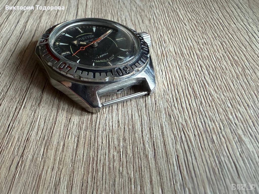 Здравейте! Продавам Восток Амфибия произведен в СССР. Касата е от неръждаема стомана. Считам, че всичко по часовникът е автентично. Работи, но не е обслужван във времето на притежание. Коронка на винт.