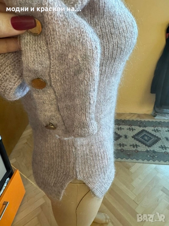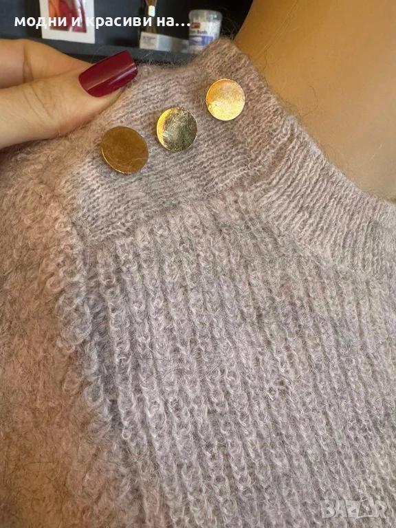 Меланжираното плетиво и златистите копчета са оригинални и запомнящи се акценти, които не остават незабелязани.