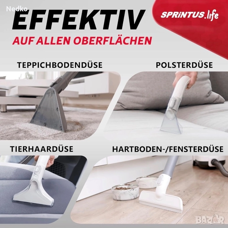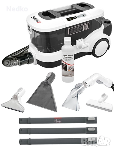 Машина за мокро почистване на тапицерии с всмукателна мощност 170 mbar за цялостно почистване на килими, тапицерии, домашни любимци, автомобили и твърди подове, хигиеничен почистващ препарат за килими и дамаски.